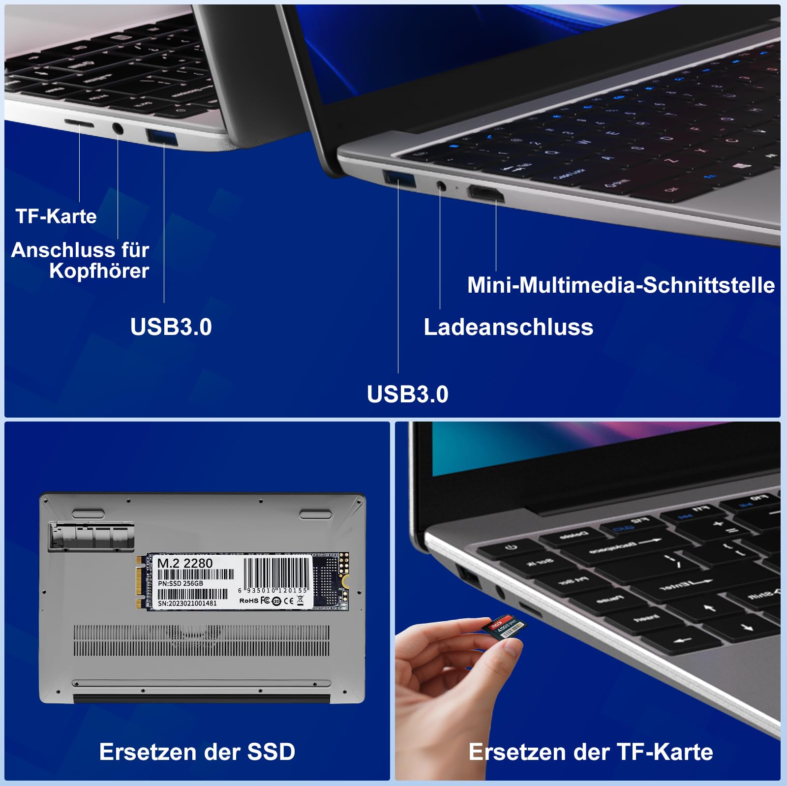 - Großer Speicherplatz: Dieser Notebook verfügt über integrierten 6 GB RAM DDR4 und 256 GB SSD-Hochgeschwindigkeitsspeicher. Sie können den Speicher wahlweise über eine TF-Karte auf 512 GB erweitern oder die SSD (die an der Unterseite des Laptop installiert werden kann) über den M.2 SATA 2280-Steckplatz auf bis zu 1 TB erweitern und so reichlich Speicherplatz sowie schnellere Lese- und Schreibgeschwindigkeiten für Ihre Dokumente, Fotos und Videos bieten