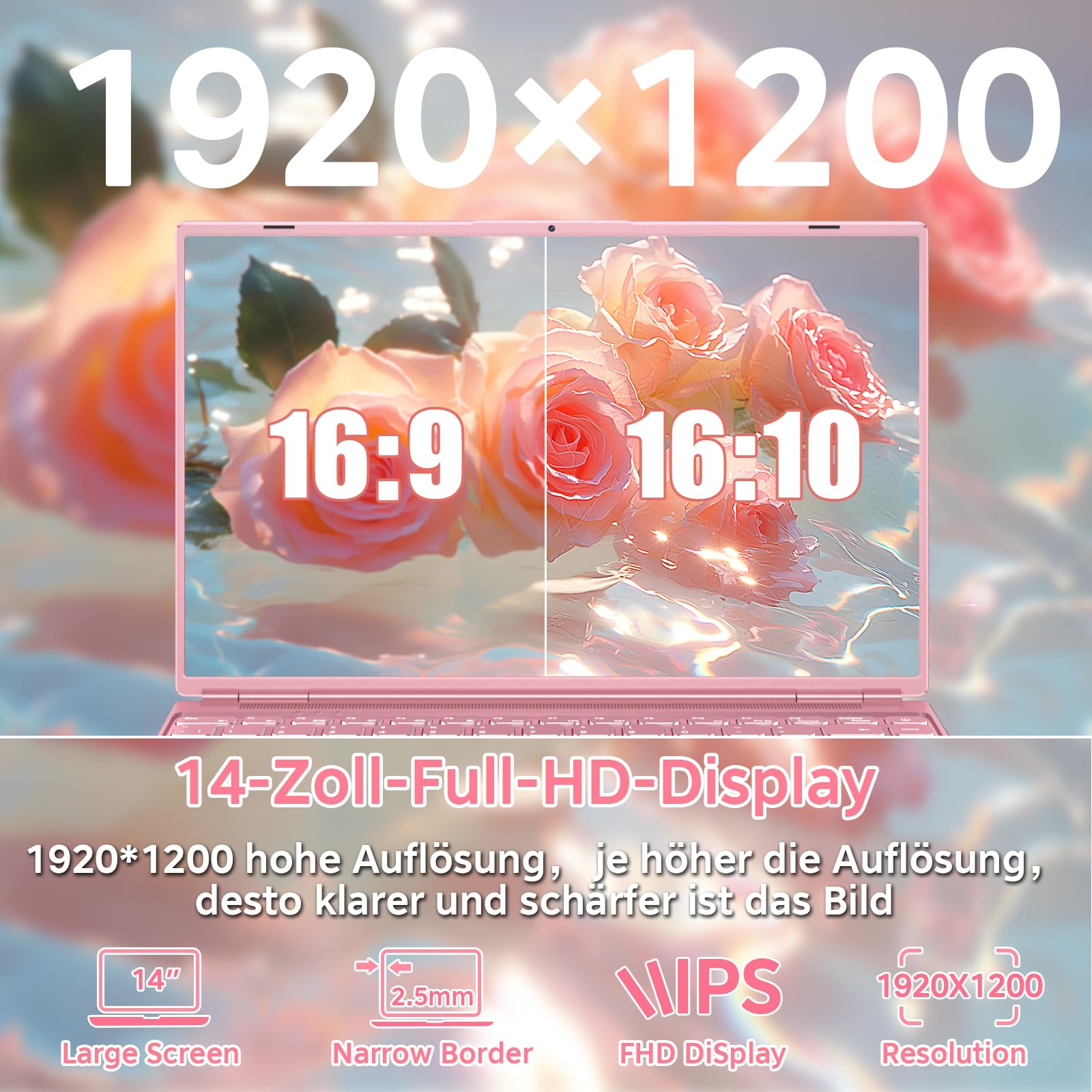 - Ultra-Wide Full-HD-Bildschirm: Das rosafarbene gaming laptop ist mit einem 14-Zoll-FHD+-IPS-Bildschirm mit einer HD-Auflösung von 1920*1200 und einem ultradünnen 2K-Rand ausgestattet, der jedes Detail klar darstellt. Das Notebook kann um 180° gedreht werden und verfügt über ein Bildschirm-zu-Körper-Verhältnis von bis zu 84 % und einen Goldenen Schnitt von 16:10. Gleichzeitig machen die eingebaute 2 MP HD-Webcam und 2,4G+5G WIFI Ihre Videokonferenzen wie von Angesicht zu Angesicht, ohne jegliche Verzögerung