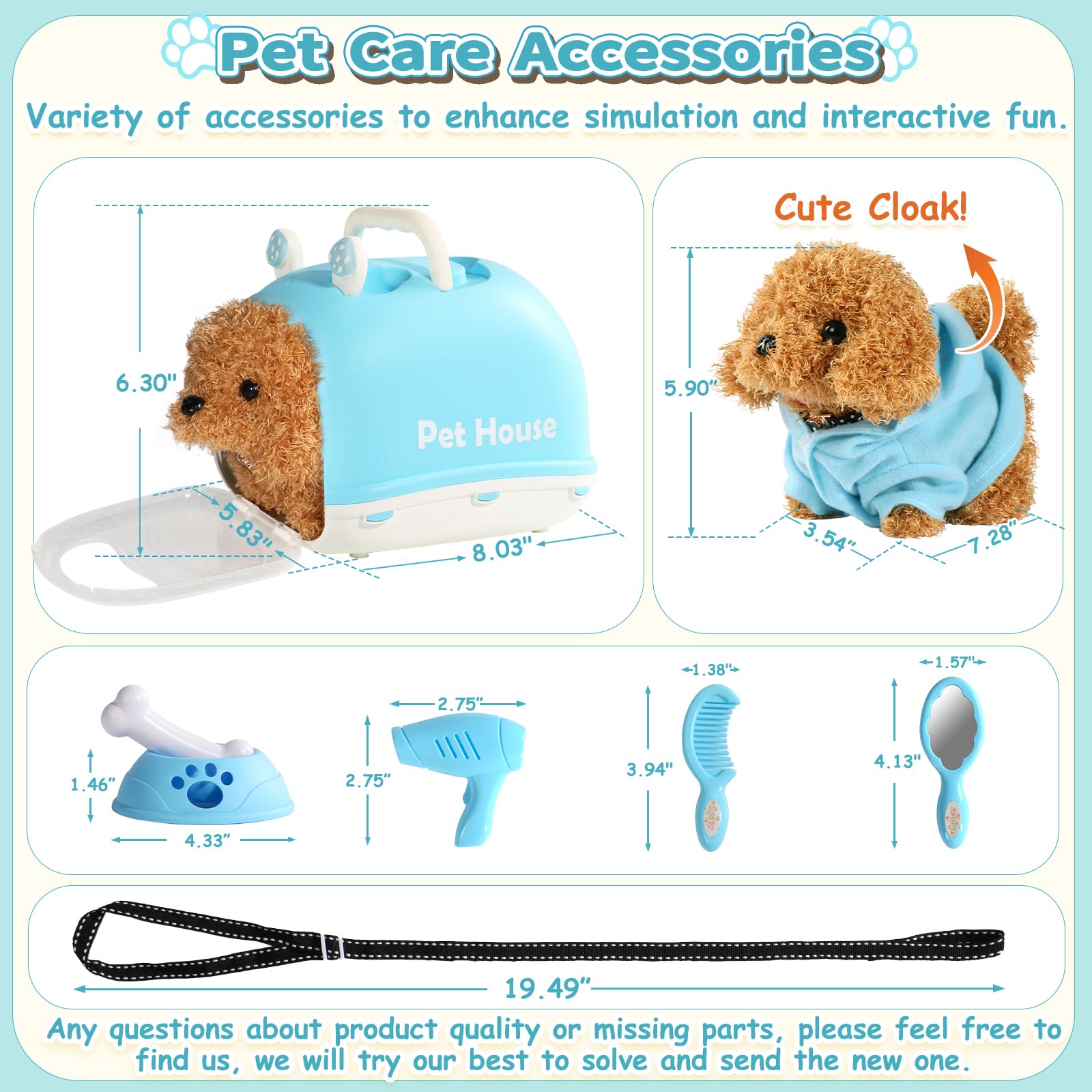 - 【Elektrischer Hund mit viel Zubehör】Das Kuscheltier Hund Spielzeug Kinder Enthält: 1 Tragbare Hundekäfig, 1 Leine, 1 süßer Umhang, 1 Kamm, 1 Spiegel, 1 Haartrockner, 1 Fressnapf und ein Knochen, keine Kleinteile enthalten. Ein niedlicher 1 kleiner Umhang wurde absichtlich hinzugefügt, um den Spaß an der Pflege des Welpen zu erhöhen. Spielzeug hund ist klein und ideal für kleine Kinderhände zum Spielen.