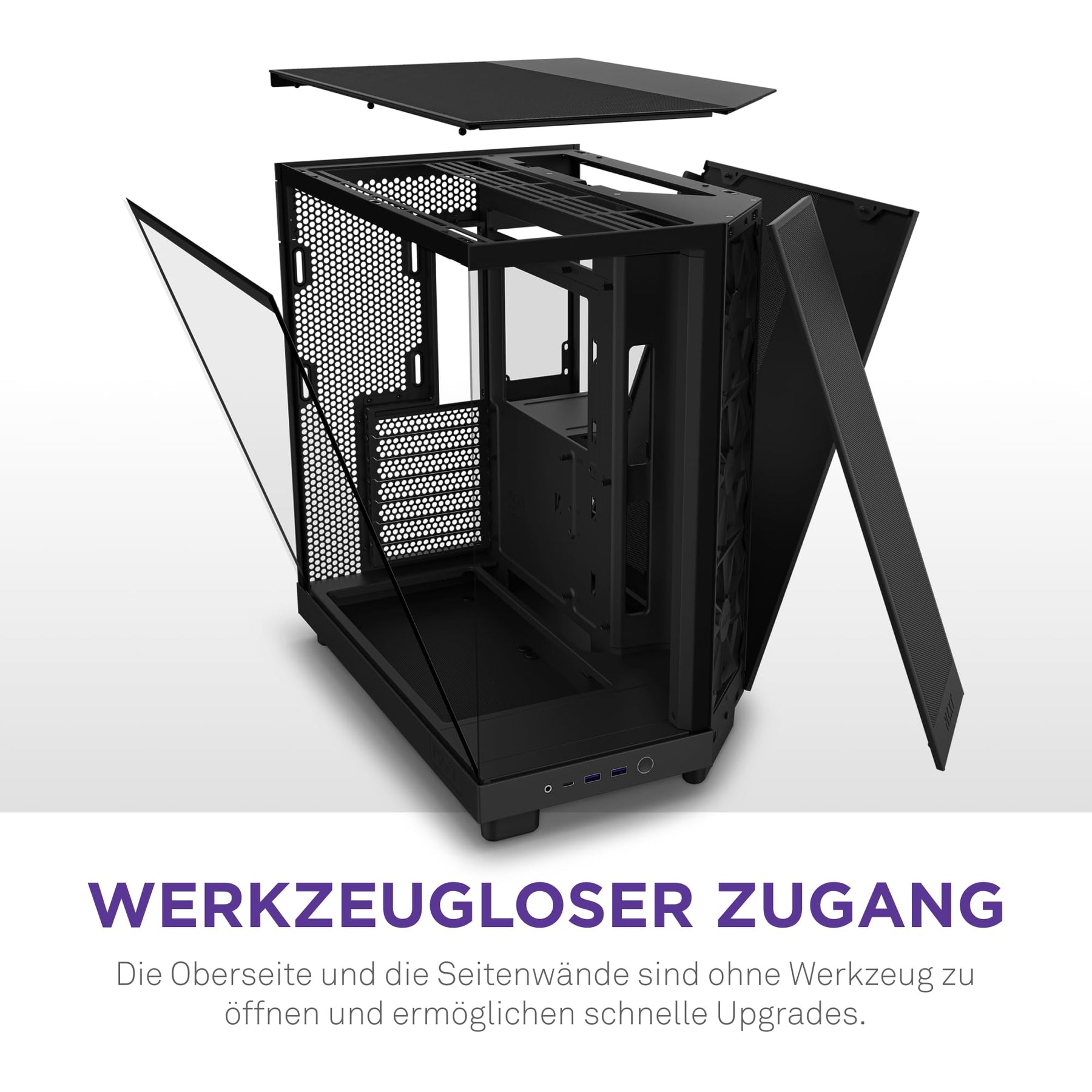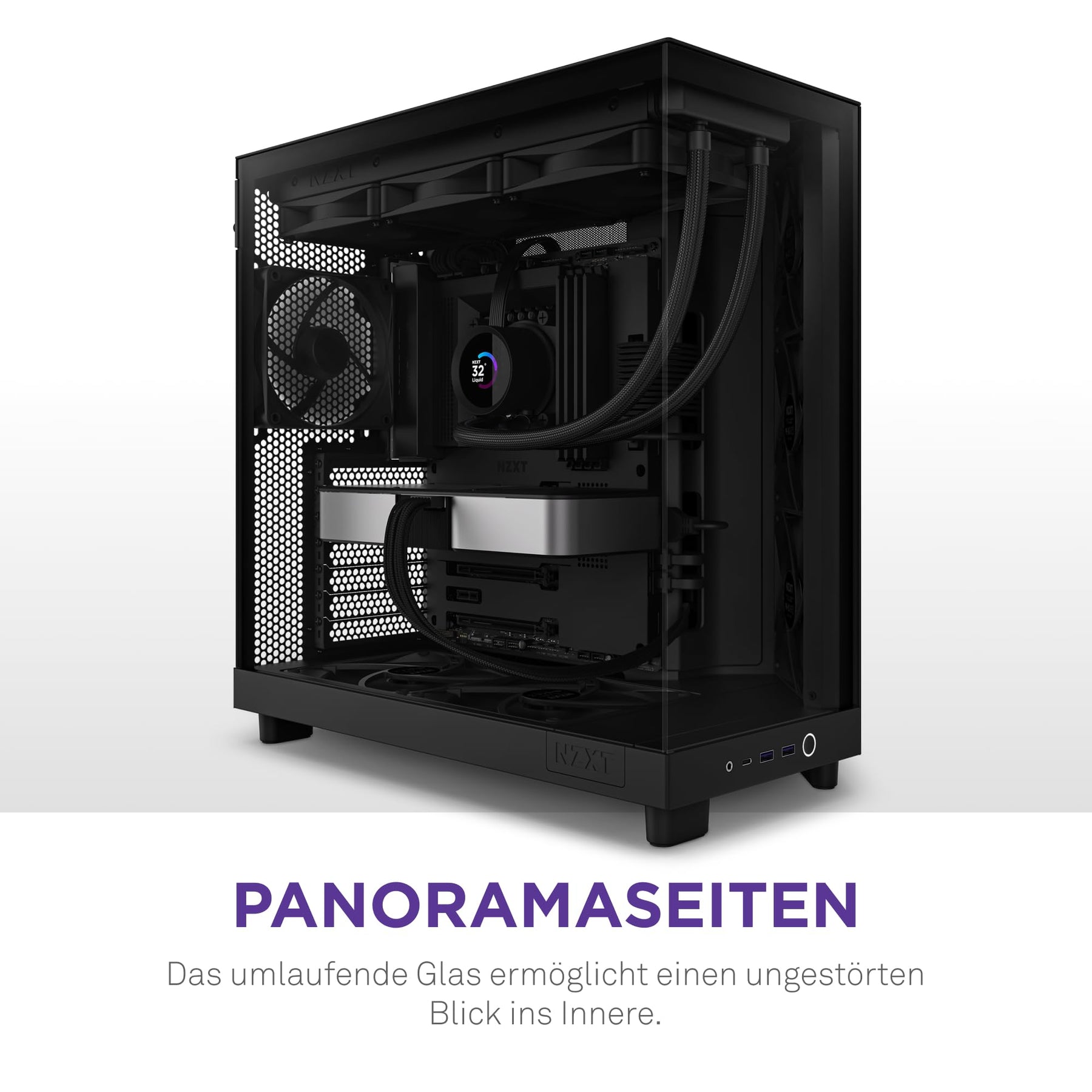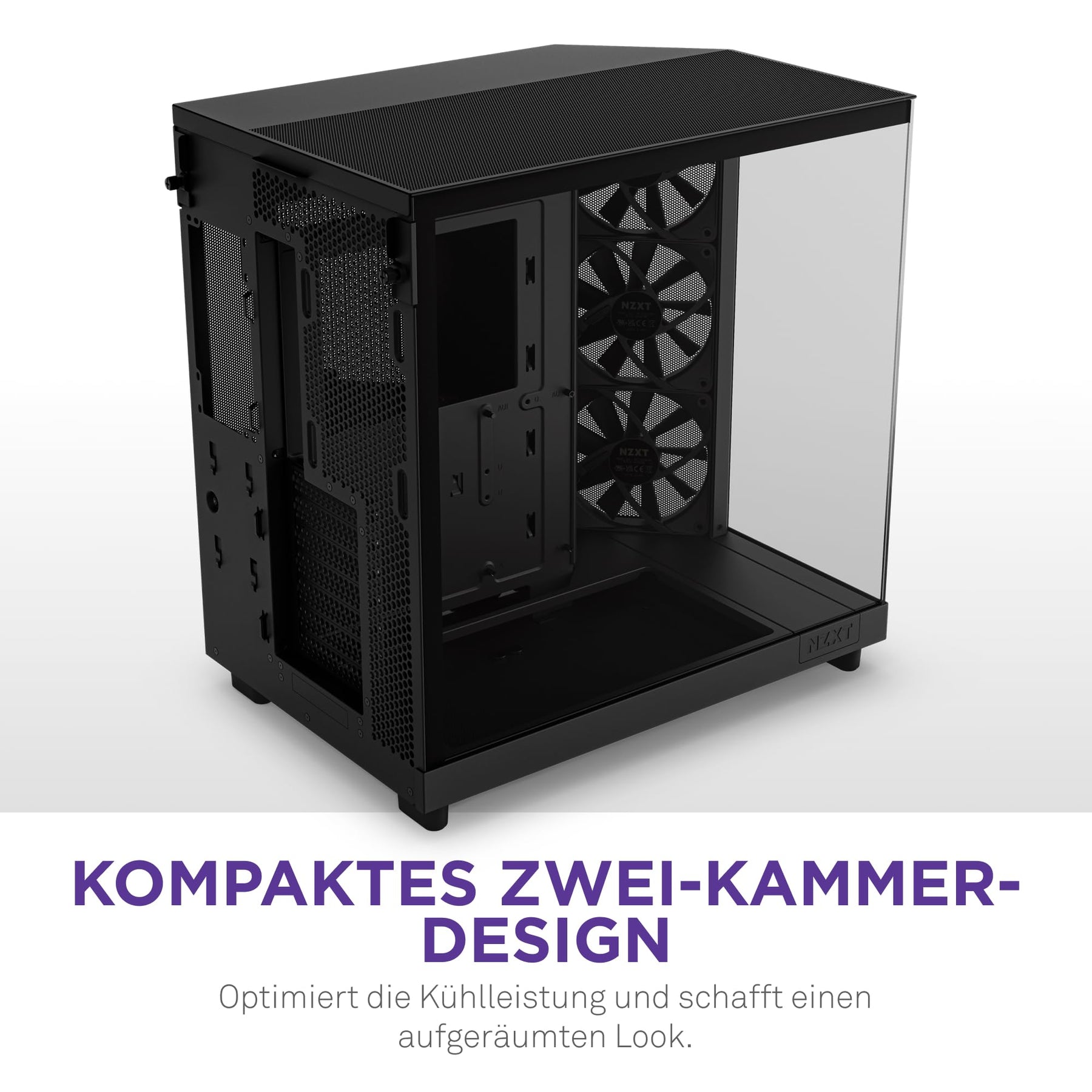Einzelheiten: Erlebe Spitzenleistung in einem innovativen, kompakten Zwei-Kammer-Gehäuse. Die Panoramascheibe stellt die GPU-Kühlung in den Vordergrund, wobei das H6 mehr Platz für einen verbesserten Luftstrom bietet.
