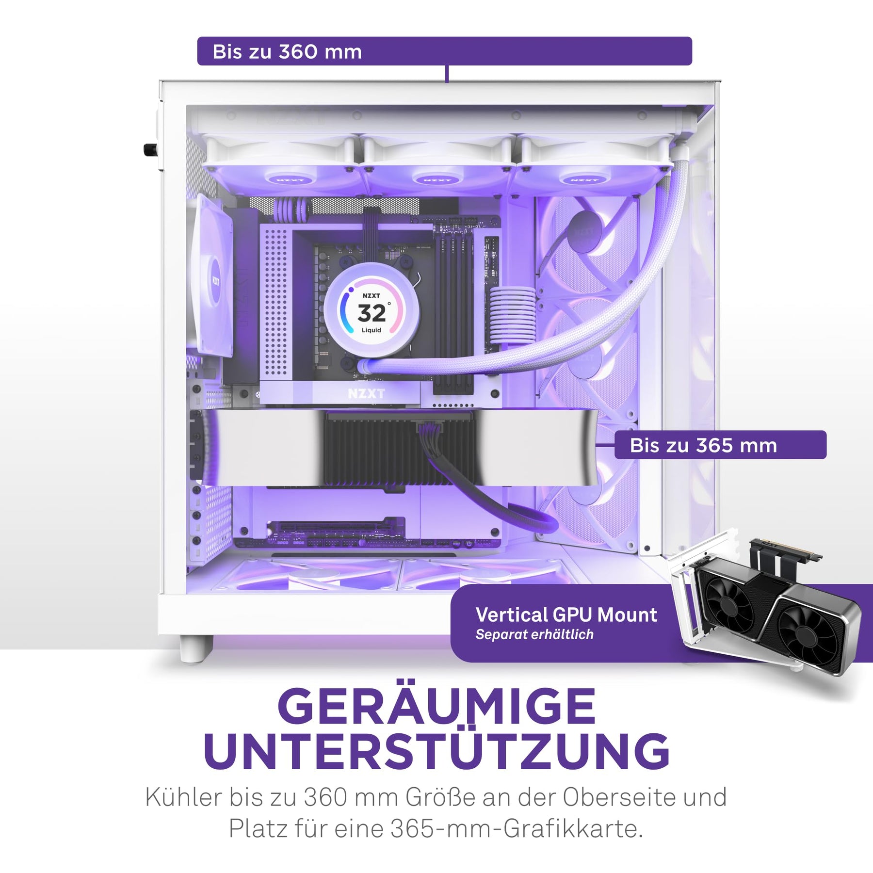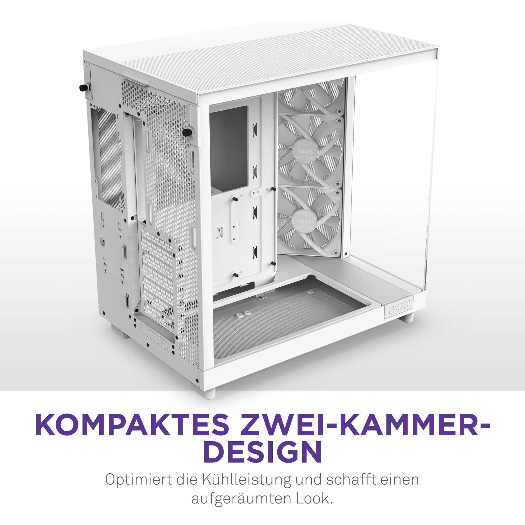 Einzelheiten: Erlebe Spitzenleistung und lebendige RGB-Beleuchtungseffekte in einem innovativen, kompakten Zwei-Kammer-Gehäuse. Die Panoramascheibe stellt die GPU-Kühlung in den Vordergrund, wobei das H6 mehr Platz für einen verbesserten Luftstrom bietet.