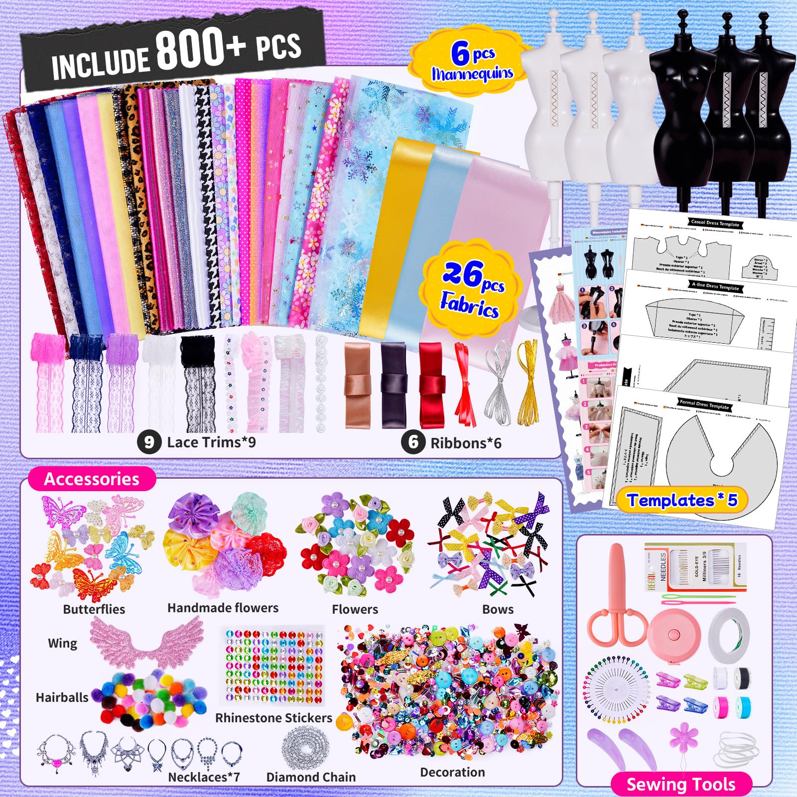 - Modedesign Mädchen mit vollständigem Werkzeugset: Mehr Quantität und Vielfalt. Das Fashion Designer Kit erfüllt alle Ihre Bedürfnisse und enthält eine große Auswahl an Materialien für mehr als 80 verschiedene Outfits. Dazu gehören 6 Kleidermannequins, Kleidungsvorlagen, Maßband, 26 Stoffe, 6 Verzierungen, 6 Bänder, Scheren, Nähwerkzeuge, über 100 schöne Blumen und Schleifen, Strasssticker und über 400 andere Verzierungen. Das beste Kit für Anfänger, die Design lieben.