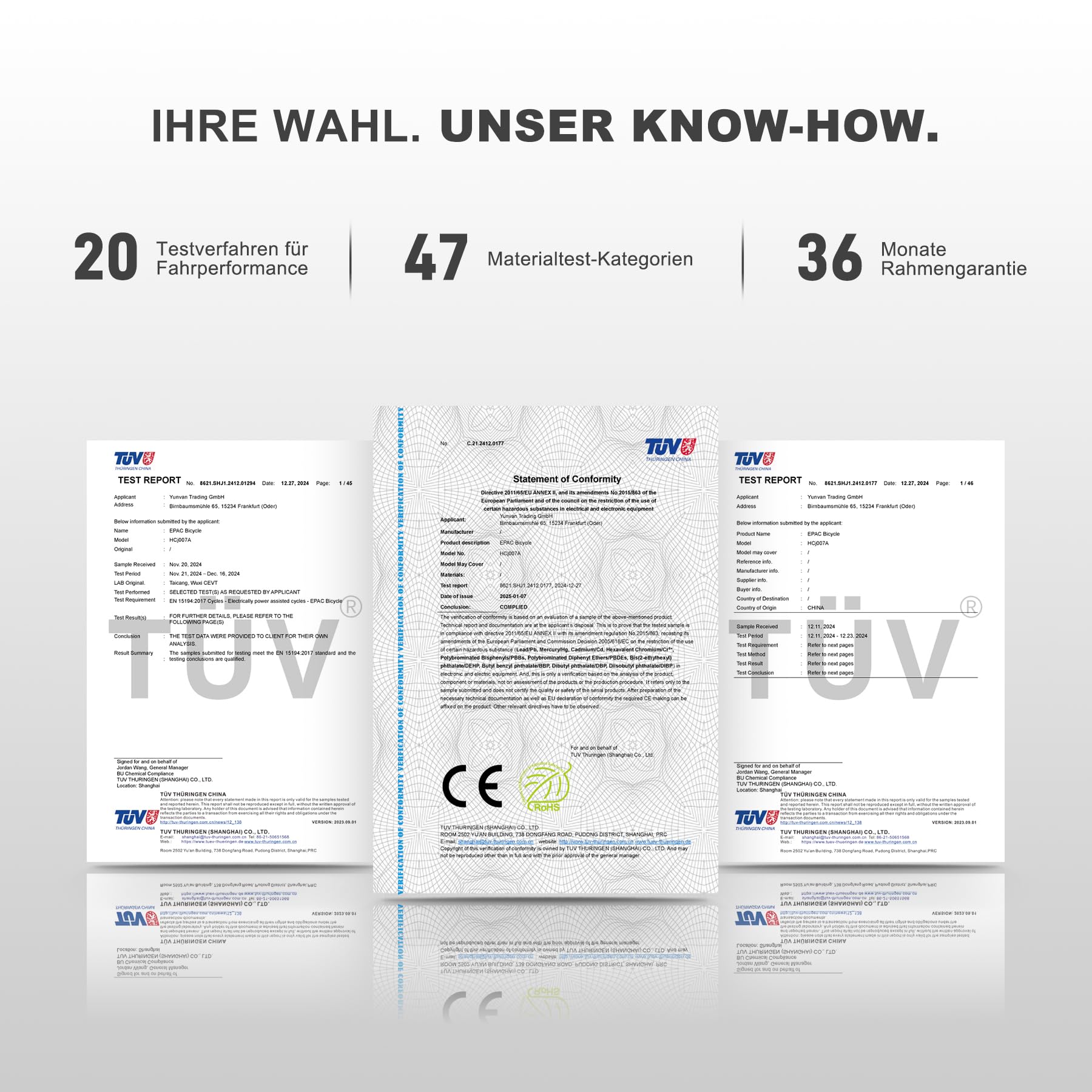 - 【Pedalkraft-Ermüdungstest】Unsere Fahrräder unterliegen strengen professionellen mechanischen Tests gemäß der internationalen Norm EN 15194-2017, Abschnitt 4.3.7.4. Dabei wird an den Pedalstellen eine Kraft von 1000 N appliziert und ein Ermüdungstest mit bis zu 100.000 Zyklen durchgeführt. Die Testergebnisse bestätigen die außergewöhnliche Haltbarkeit der Pedale und des Antriebssystems sowie deren strukturelle Stabilität. Selbst bei langfristigem, frequentem Fahrbetrieb und anhaltender Pedalbelastung auf anspruchsvollem Terrain widersteht das System effektiv Verschleiß, Verformung und Bruchrisiken. Dies bietet zuverlässige Sicherheit beim Fahren.