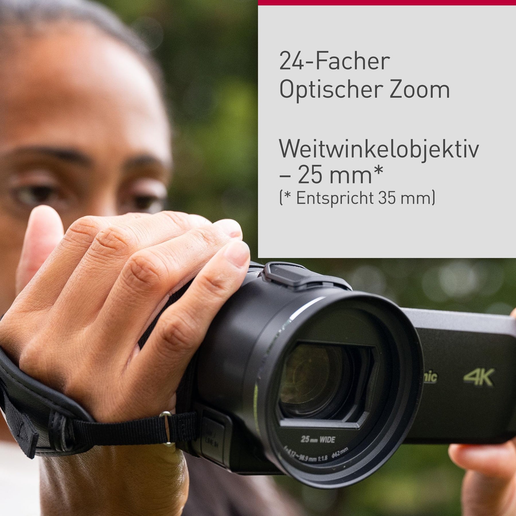 Einzelheiten: 4K-Ultra-HD-Camcorder mit lichtstarkem F1,8-Objektiv, 25 m Weitwinkel, 24fach optischem Zoom und 4K-Cropping für hervorragende Nachbearbeitungsergebnisse