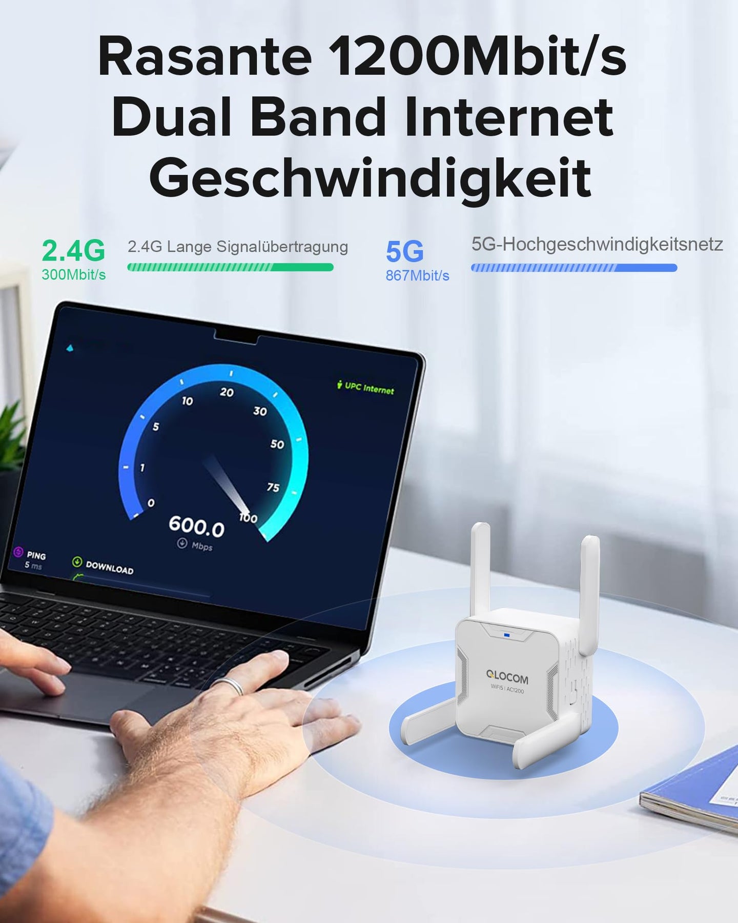 QLOCOM 2025 Neuestes WLAN Verstärker WLAN Repeater AC1200 (867MBit/s 5GHz + 300MBit/s 2,4GHz), DualBand WiFi Internet Verstärker mit Ethernet Port, Kompatibel Allen WLAN Geräten