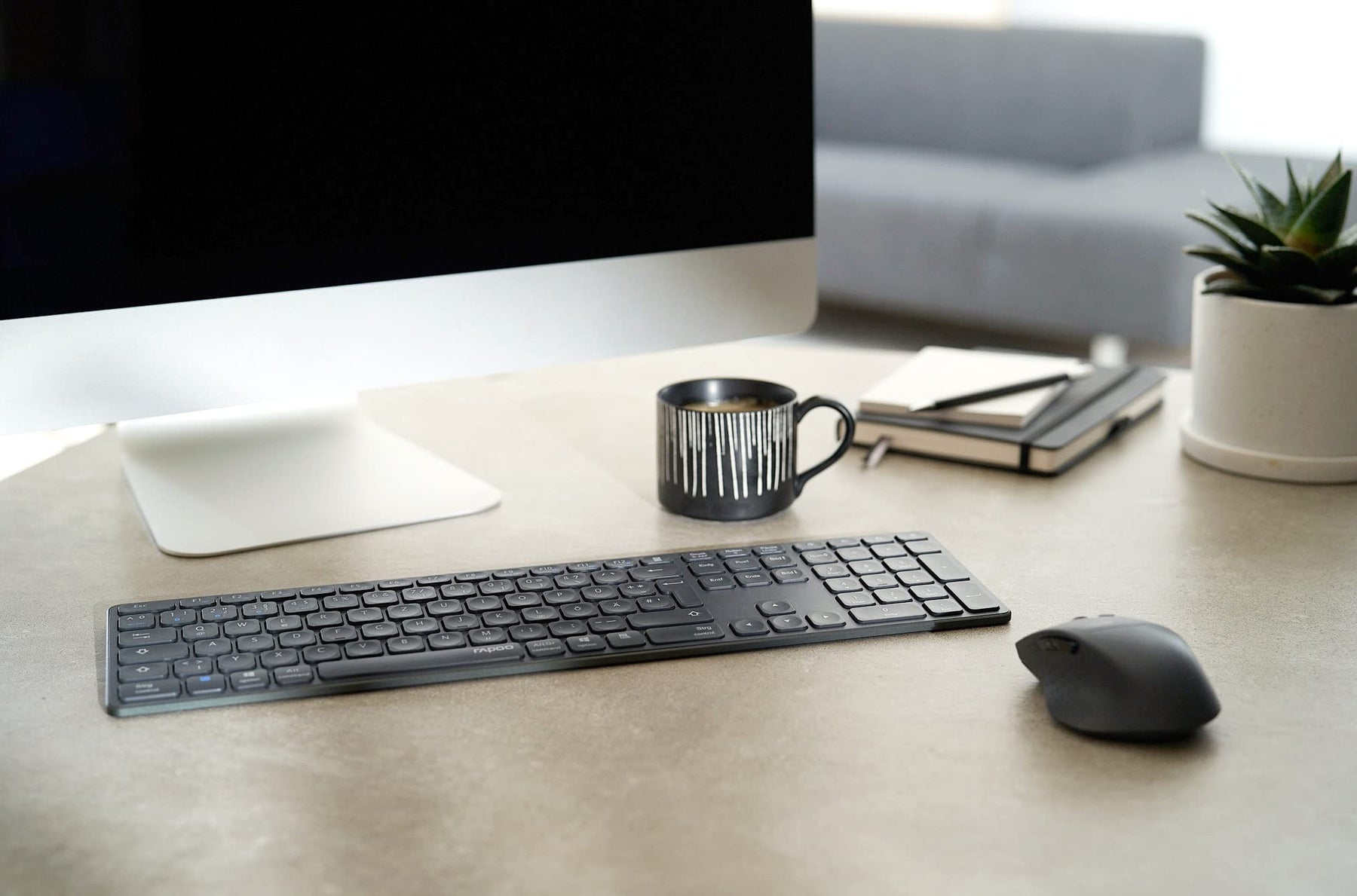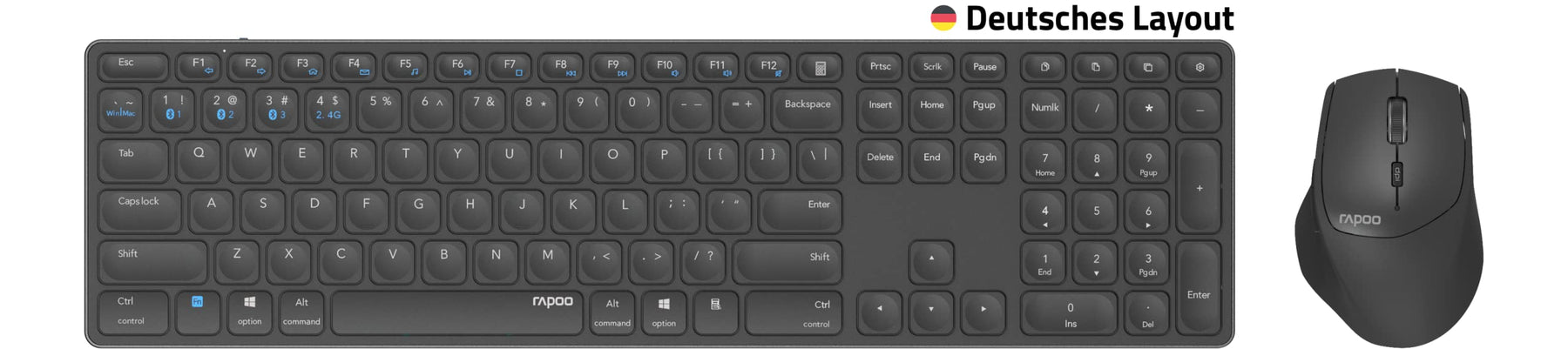 Einzelheiten: Rapoo 9800M kabelloses Tastatur-Maus Set Wireless Deskset 1600 DPI Sensor wiederaufladbarer Akku flaches Aluminium Design DE-Layout QWERTZ PC & Mac - dark grey