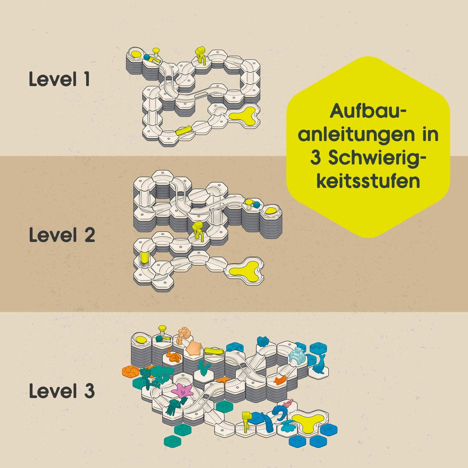 • Die enthaltenen Aufbauanleitungen erleichtern den Einstieg, danach sind der Kreativität keine Grenzen gesetzt; durch verschiedene Erweiterungen können Kinder ihre Kugelbahnen vergrößern und immer wieder gestalten - langanhaltender Spielespaß garantiert