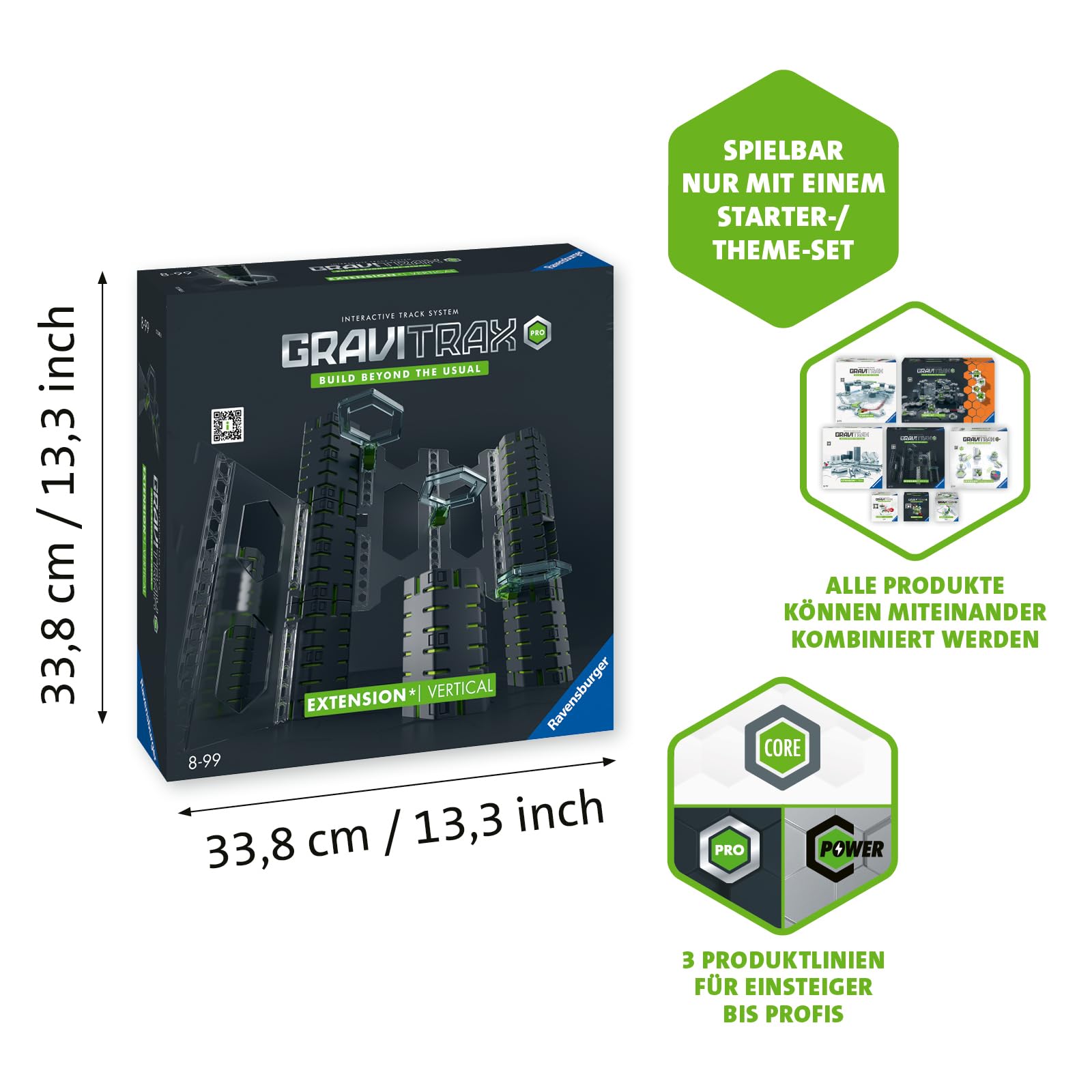 Die GraviTrax PRO Extension Vertical ermöglicht das Bauen in die Höhe und bringt damit mehr Möglichkeiten in die GraviTrax-Bahn. Die PRO Extension Vertical beinhaltet viele verschiedene Bauteile um in die Höhe zu bauen. Kombiniert mit einem beliebigen GraviTrax Starter-Set bringt die PRO Extension Vertical noch mehr Möglichkeiten und Komplexität in das GraviTrax-Universum. Auf wie vielen Ebenen können die Kugeln rollen? GraviTrax ist ein flexibel erweiterbares, interaktives Kugelbahnsystem für Kinder ab 8 Jahren: Mit GraviTrax bauen Kinder, Jugendliche und Erwachsene nicht nur einfache Kugelbahnen. Sie erschaffen einzigartige Kugelbahnwelten. Durch das freie Konzipieren der Kugelbahnen und das Erforschen des Rollverhaltens der Kugeln wird das Verständnis für Wissenschaft geschärft und Schwerkraft hautnah erlebbar. Das GraviTrax Universum beinhaltet drei spannende Linien CORE, PRO und POWER. Alle GraviTrax Linien und Produkte können frei miteinander kombiniert werden. Durch unzählige Erweiterungen mit klassischen Bauelementen oder Steine, die besondere Action und Tricks ermöglichen, lässt sich das GraviTrax-Universum unendlich vergrößern. So kann jeder individuell tüfteln, ausprobieren und über sich hinausbauen.