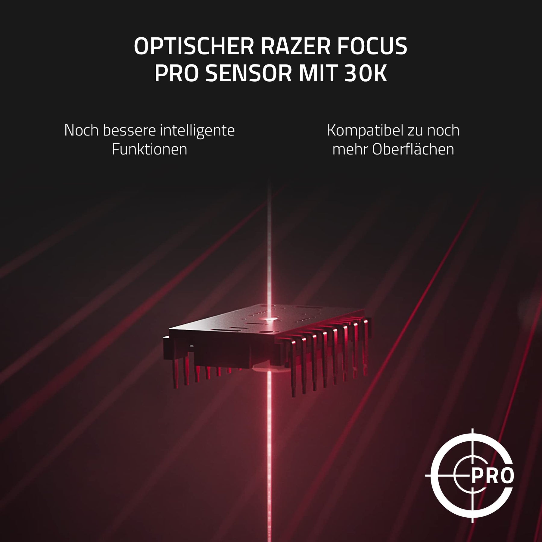 - Optischer Razer Focus Pro Sensor mit 30K Klassenbeste Präzision: Dieser brandneue Sensor von Razer sorgt für eine fehlerfreie Tracking-Performance auf einer Vielzahl von Oberflächen, inklusive Glas, ergänzt durch intelligente Funktionen für noch besseres Zielen und mehr Kontrolle.