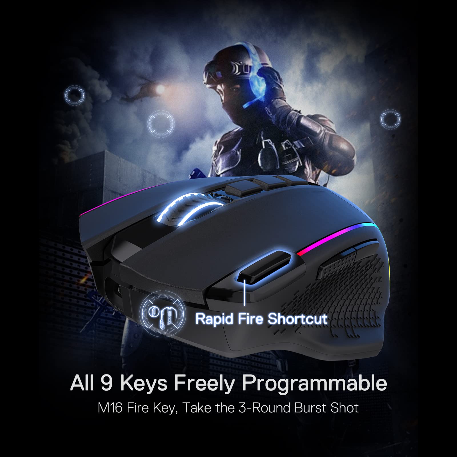 Redragon M991 kabellose Gaming-Maus, 19000 DPI kabelgebundene/drahtlose Maus mit Schnellfeuertaste, 9 Makro-Tasten, 45-Stunden-Dauerleistung und RGB-Hintergrundbeleuchtung für PC/Mac/Laptop