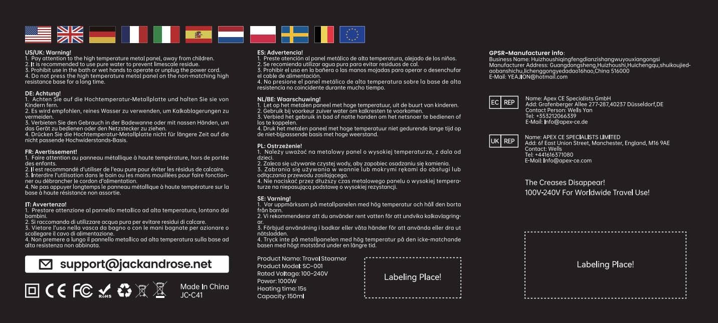 - 100-240 V Dual Spannung Dampfglätter: Jack & Rose Pionier-Technologie mit Weitspannung von 100-240 V, Plug-and-Play, passt sich automatisch an die globale Spannung an. Keine Sorgen mehr beim Reisen ins Ausland, dass das Bügeln aufgrund unterschiedlicher Spannungen nicht möglich ist.
