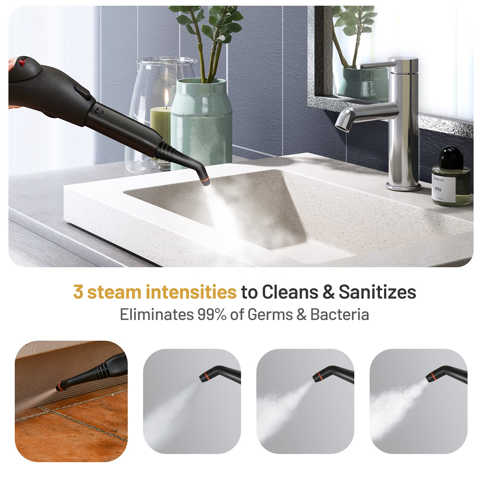 - ★ Effektive Sterilisation und Verriegelungsfunktion ★ Die Dampftemperatur von dem Dampfreiniger kann bis zu 108 °C betragen, wodurch Schmutz effektiv aufgelöst und Bakterien abgetötet werden können, wodurch Sie eine saubere und gesunde häusliche Umgebung erhalten. Dank der Verriegelungsfunktion müssen Sie den Dampfknopf nicht kontinuierlich drücken.