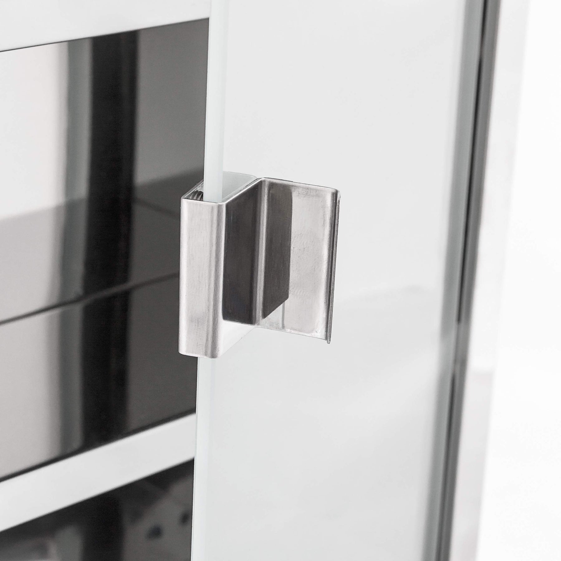 Das glänzende Metall wirkt im Zusammenspiel mit dem satinierten Glas modern und elegant. Der Schrank fügt sich dezent und freundlich in Ihr Badezimmer ein. Die in der Tür eingelassene Aussparung in Kreuzform schließlich ist praktische Sichtluke und Deko-Element zugleich.