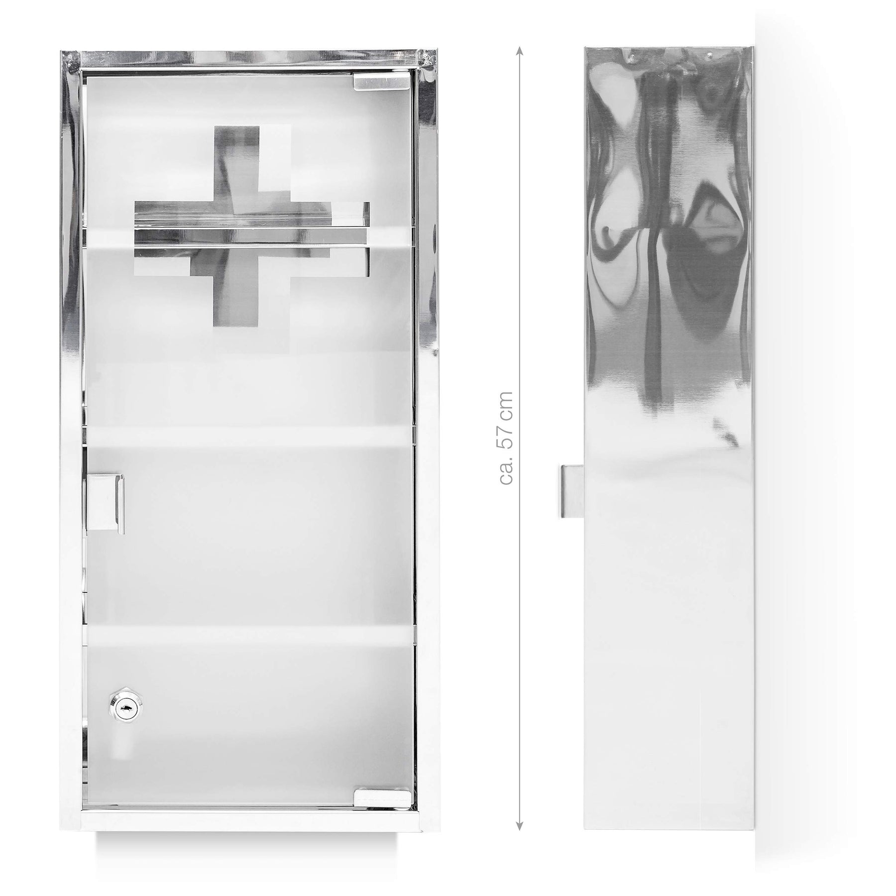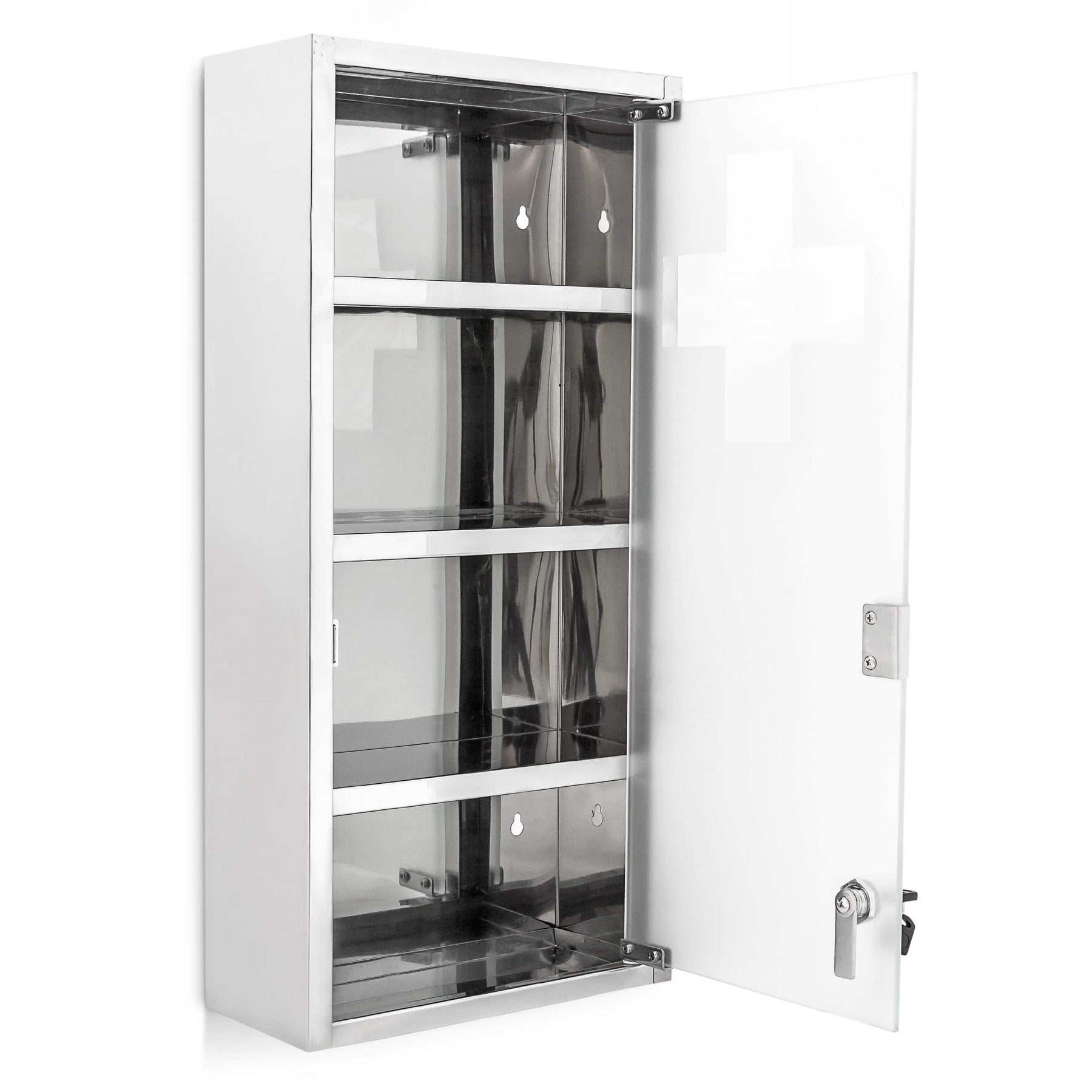 In diesem großen Erste-Hilfe-Schrank findet alles Platz, was wichtig für die medizinische Versorgung ist und in Ihre Hausapotheke gehört. Die 4 geräumigen Fächer bieten viel Stauraum für Medikamente, Verbandszeug und vieles mehr. Dank der abschließbaren magnetischen Glastür können Sie den Inhalt dabei kindersicher verstauen.