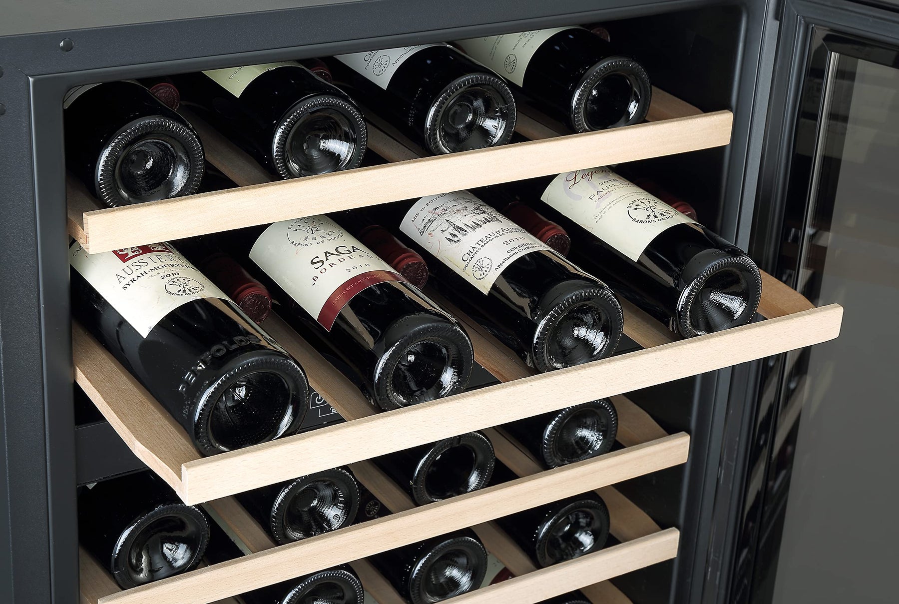 Einzelheiten: Respekta bietet Ihnen Küchen- und Elektrogeräte zu guten Preisen, die Ihr Leben schöner machen. Unsere Produkte stehen für modernes Design, tadellose Qualität und angenehme Preise. Mit unserer großen Auswahl an Haushalts-Großgeräten bieten wir Ihnen ein breites Produktportfolio, um Ihren Alltag zu erleichtern. Alle unsere Produkte sind zertifiziert und erfüllen den Europäischen Sicherheitsstandard – somit können Sie sich auf hochwertige Haushalts-Elektrogeräte freuen. Unser Respekta Unterbau-Weinkühlschrank Bruno (WKSU46-19) bietet mit den 2 Temperaturzonen die besten Bedingungen für die optimale Lagerung und Reifung unterschiedlicher Weine und Getränke. Beide Zonen können individuell zwischen 5 – 22°C eingestellt werden. Das Fassungsvermögen von 129L bietet Platz für 46 Standardflaschen. Das zeitlose Design mit schwarzer Glastür, Edelstahlrahmen und LED-Beleuchtung passt in jeden Raum – ideal für Küche, Arbeitszimmer, aber auch Gastronomie und Geschäftsräume. Die praktischen ausziehbaren Holzablagen mit Teleskopauszügen runden das Design ab. Der wechselbare Türanschlag, das Display mit Touch Control, die Kindersicherung, die Temperaturspeicherfunktion, der akustische Temperaturalarm, die Feuchtigkeitskontrolle, das Wasserreservoir für Kondenswasser & das automatische Abtauverfahren sorgen für eine erstklassige Ausstattung. Unser kleiner Weinflaschenkühler ist mit einer Geräuschemission von max. 43 dB sehr leise und verfügt über ein Antivibrationssystem. Die Kühlvitrine für Weine umfasst eine Größe von 84,5 – 86,5 x 59,5 x 57cm (HxBxT) und ein Gewicht von 43kg. Die Einbaumaße betragen 87 x 60,5 x 57,5cm (H x B x T). Das Kühlgerät ist mit der Energieeffizienzklasse G nach EU-Verordnung 2019/2019EG ausgezeichnet und weist einen geschätzten Jahresenergieverbrauch von 144kW/h auf. Respekta steht seit 1977 für beste Qualität und preiswerte Produkte, welche sowohl in Funktionalität als auch Design überzeugen.