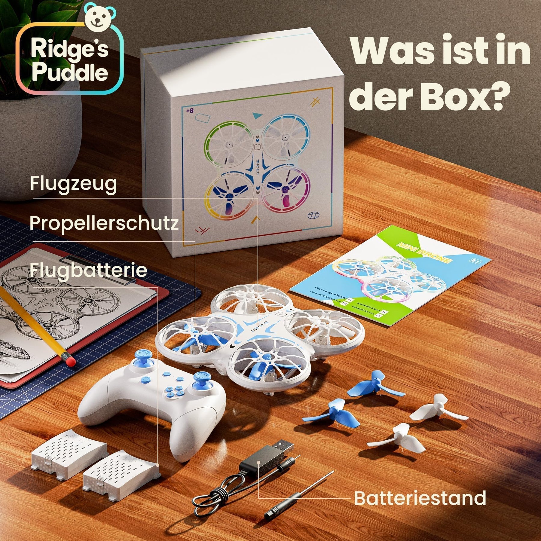 - Komplettes Set: 1x Drohne, 2–3 Akkus, 1x Fernsteuerung, 1x Ladekabel, 4x Ersatzpropeller sowie eine Bedienungsanleitung. Mit bis zu 24 Minuten Flugzeit und Ersatzteilen für Notfälle genießen Kinder ununterbrochenen Spielspaß.