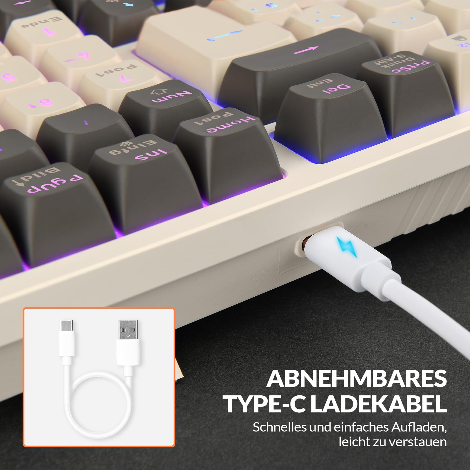 - 【Datenkabel ist austauschbar】Das Kabel kann nach längerem Gebrauch abgenutzt sein. Sie können es durch ein beliebiges Kabel ersetzen, das Sie zu Hause haben, um die Lebensdauer der Keyboard Gaming Tastatur 75 Prozent zu verlängern. Hinweis: Die Gaming-Tastaturen für PC muss zum Betrieb eingesteckt sein.