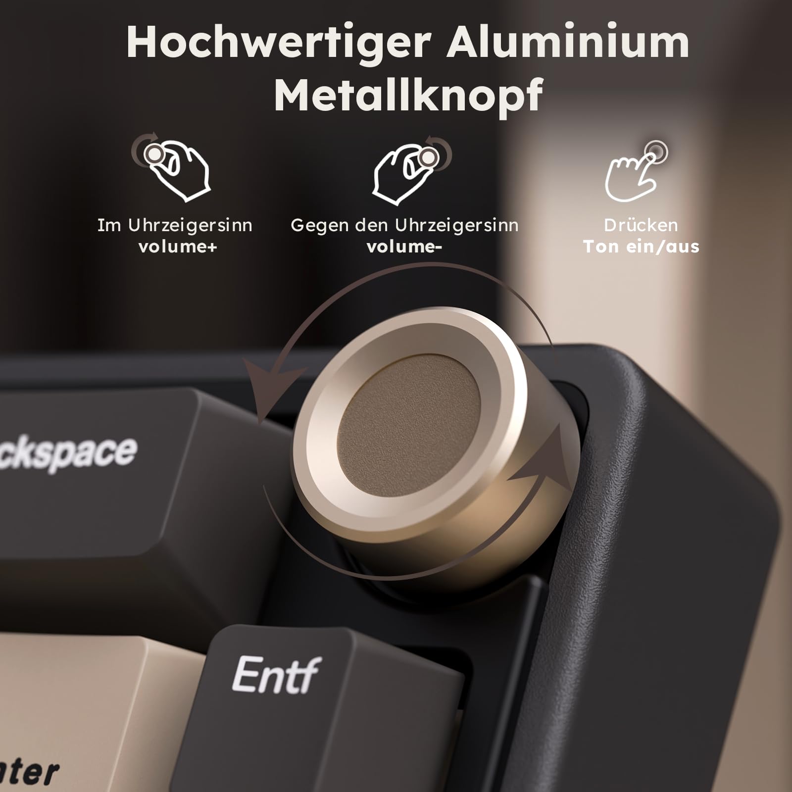 - 【CNC-Metallknopf und PBT-Tastenkappen】 Die Tastatur gaming ist mit hochwertigen Aluminium-CNC-knöpfen ausgestattet. Sie können die Lautstärke Ihres Geräts durch einfaches Drehen des Knopfes einstellen. Durch Drücken des Knopfes wird der Ton ein-/ausgeschaltet. Zweifarbige, spritzgegossene PBT-Tastenkappen sorgen für ein verbessertes Fingerspitzengefühl und eine bessere Haltbarkeit. Vorgeschmierte Stabilisatoren und NKRO verbessern die Stabilität und die Genauigkeit der Tastenanschläge