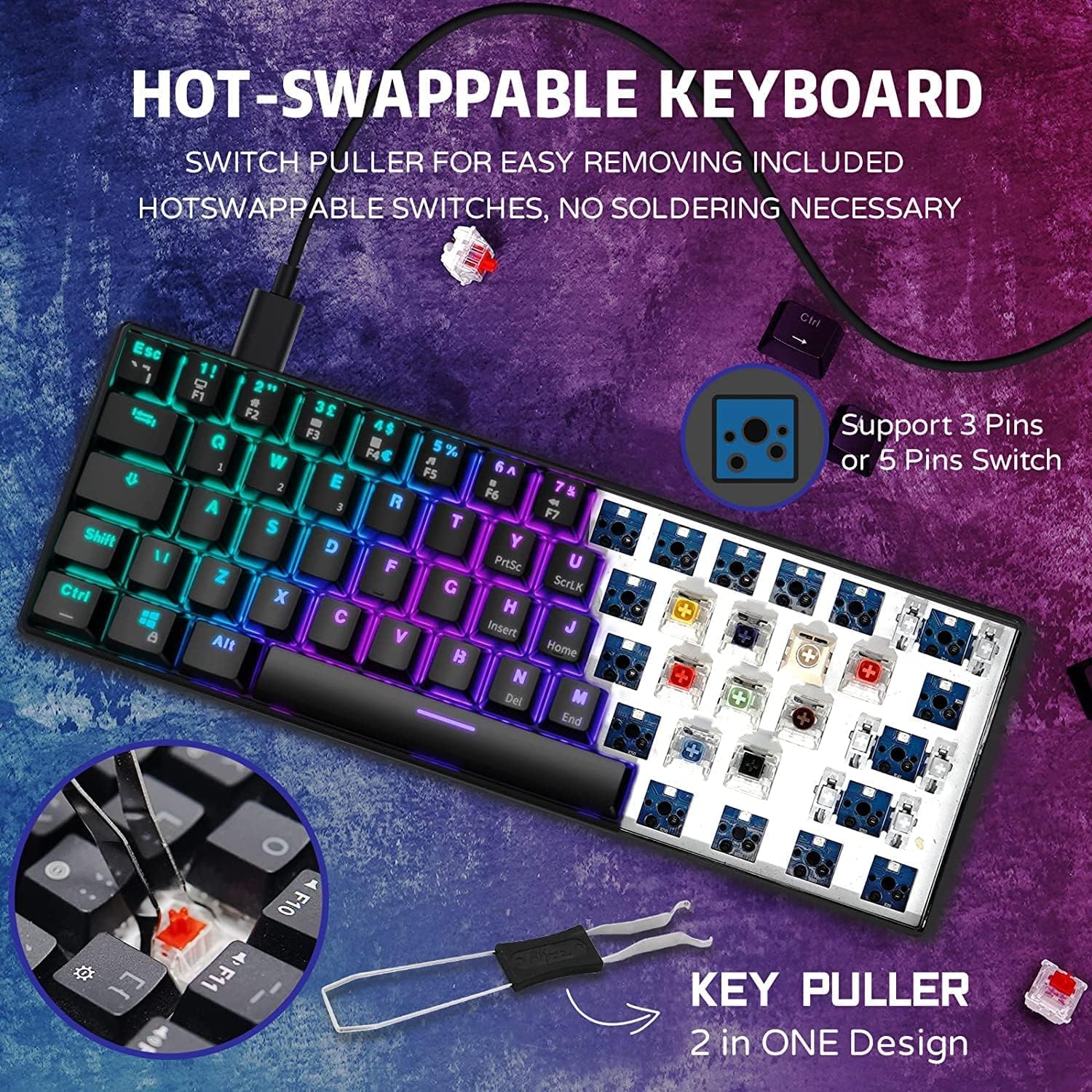 - 【Hot-Swap-fähiger Blauer Schalter】Die Hot-Swap-Platine ermöglicht es Ihnen, die 3-Pin/5-Pin-Switch frei zu ersetzen, ohne dass Sie löten müssen. Für Angestellte und Spieleliebhaber, wie kann ihnen eine empfindliche und zuverlässige Tastatur fehlen? Starkes Gefühl von gestochen scharfem und taktilem Feedback bei jedem Tastendruck