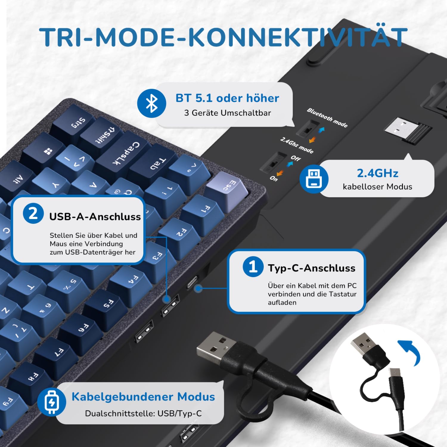 - 【Verbindung mit drei Modi und sowohl USB- als auch Typ-C-Schnittstellen optimiert】Die mechanische Tastatur RK98 bietet drei verschiedene Verbindungsmodi: kabelgebunden, Bluetooth und 2,4 GHz. Mit nur einem einfachen Umschalten ist es nun möglich, zwischen drei unterschiedlichen drahtlosen Geräten zu wechseln, ohne dass es dabei Einschränkungen bei den Verbindungsmöglichkeiten gibt. Zusätzlich verfügt diese kabellose mechanische Tastatur über zwei USB- und eine Typ-C-Schnittstelle. Sie enthält zudem ein Typ-C-zu-USB-Datenkabel, welches ermöglicht, verschiedene Geräte anzuschließen