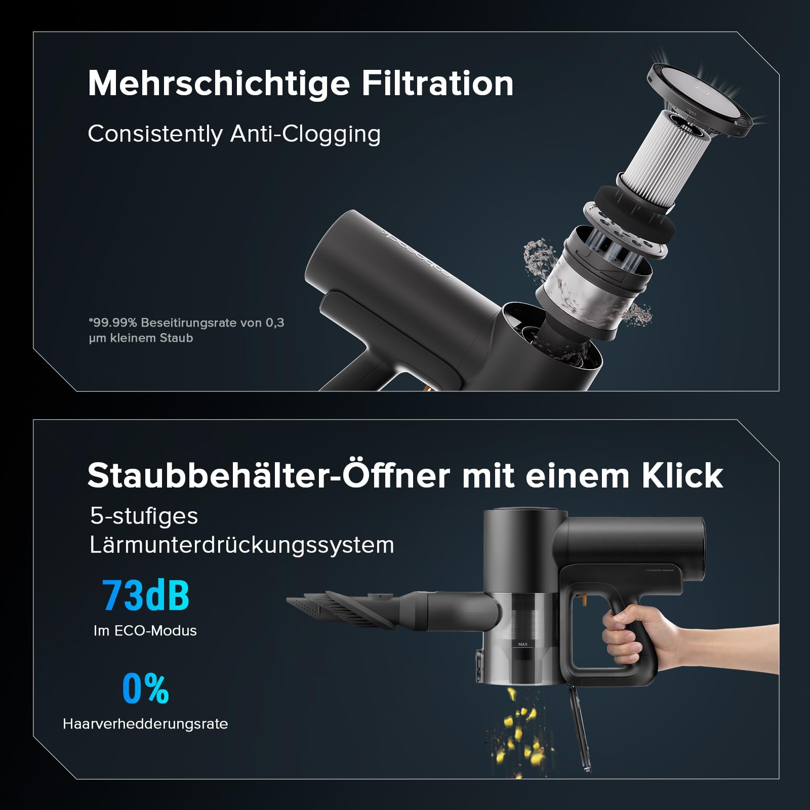 • Mühelose Manövrierbarkeit: Der um 70° drehbare Reinigungskopf, KI-unterstützte Räder und der strategisch platzierte Wassertank ermöglichen eine reibungslose und mühelose Reinigung auf allen Oberflächen. Bis zu 60 Minuten Betriebsdauer im ECO-Modus.
