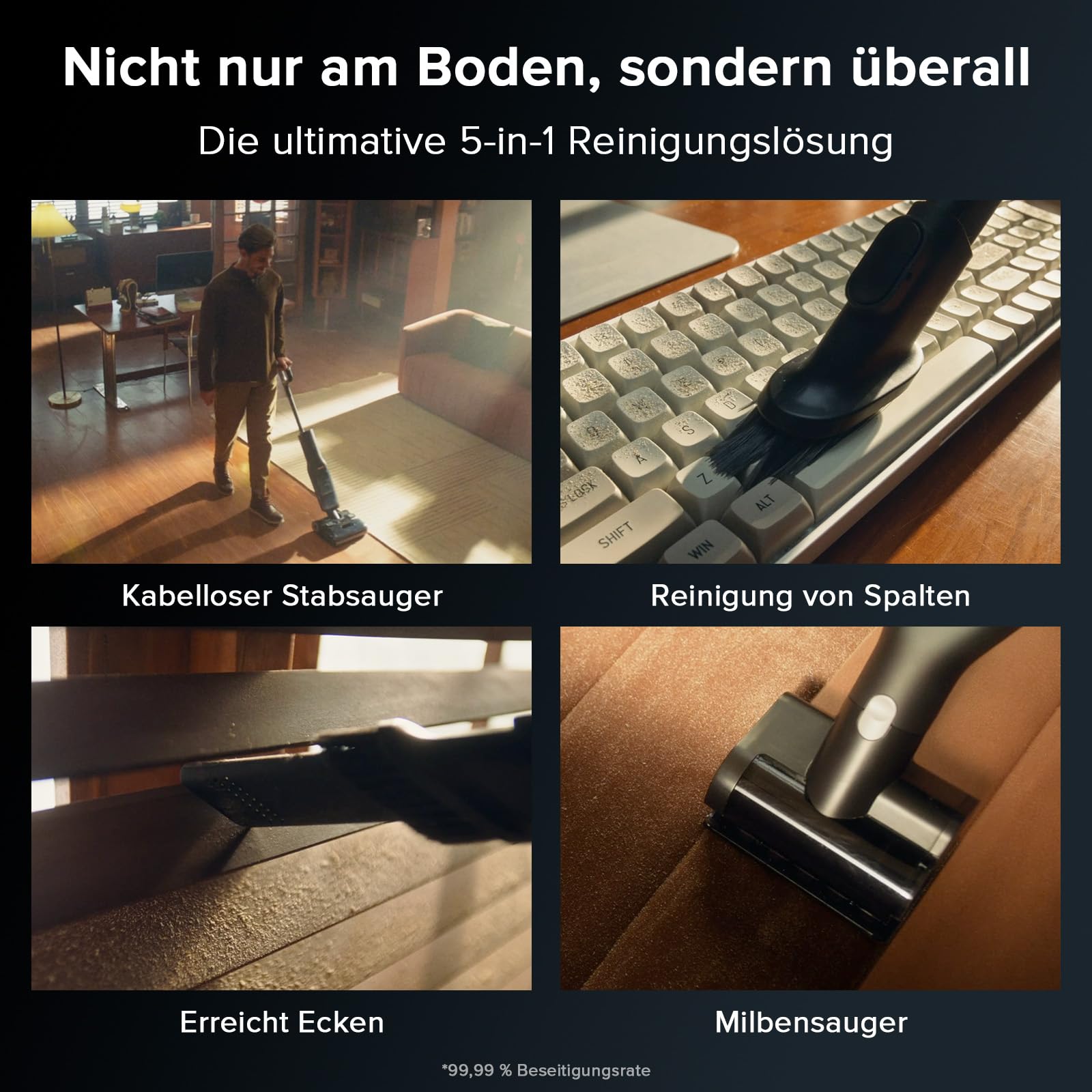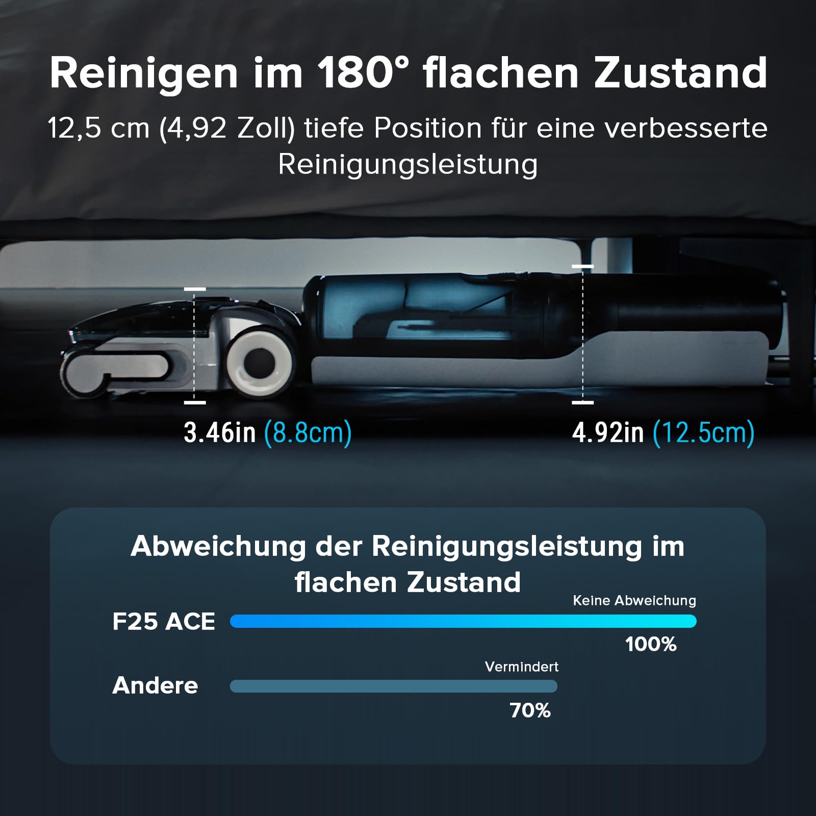 • Tiefenreinigung für jede Art von Schmutz: Mit einer Absaugleistung von 20.000 Pa bewältigt der F25 ACE Combo nasse und trockene Verschmutzungen mit Leichtigkeit - verschüttete Getränke, Tierhaare, klebrige Flecken und alltäglicher Schmutz haben keine Chance. Mit seinem ultraschlanken Design gelangt er mühelos unter Möbel.