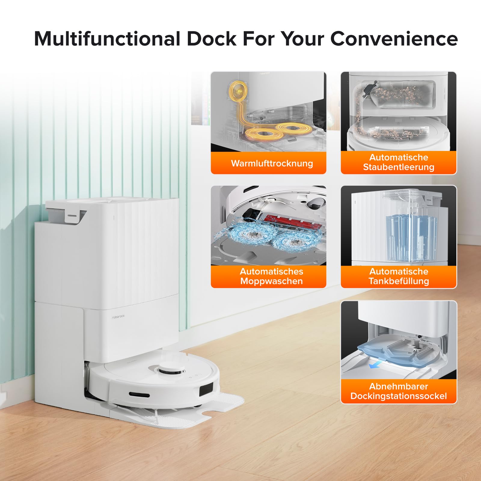 • All-in-One-Andocksystem und die fortschrittlichste Reinigungstechnologien. Vergiss Putzen - wirklich! roborock Qrevo Saugroboter mit Wischfunktion und Absaugstation unterstützt automatische Wasser-Befüllung/Entleerung, automatische Staubbeutel-Entleerung, automatische Reinigung der Mops plus Trocknung per Heißluft. Mit dem roborock All-in-One-Andocksystem und der roborock Qrevo Staubsaugerroboter mit Wischfunktion lassen Sie Ihre Hände frei haben und Ihre Zeit klüger genießen können.