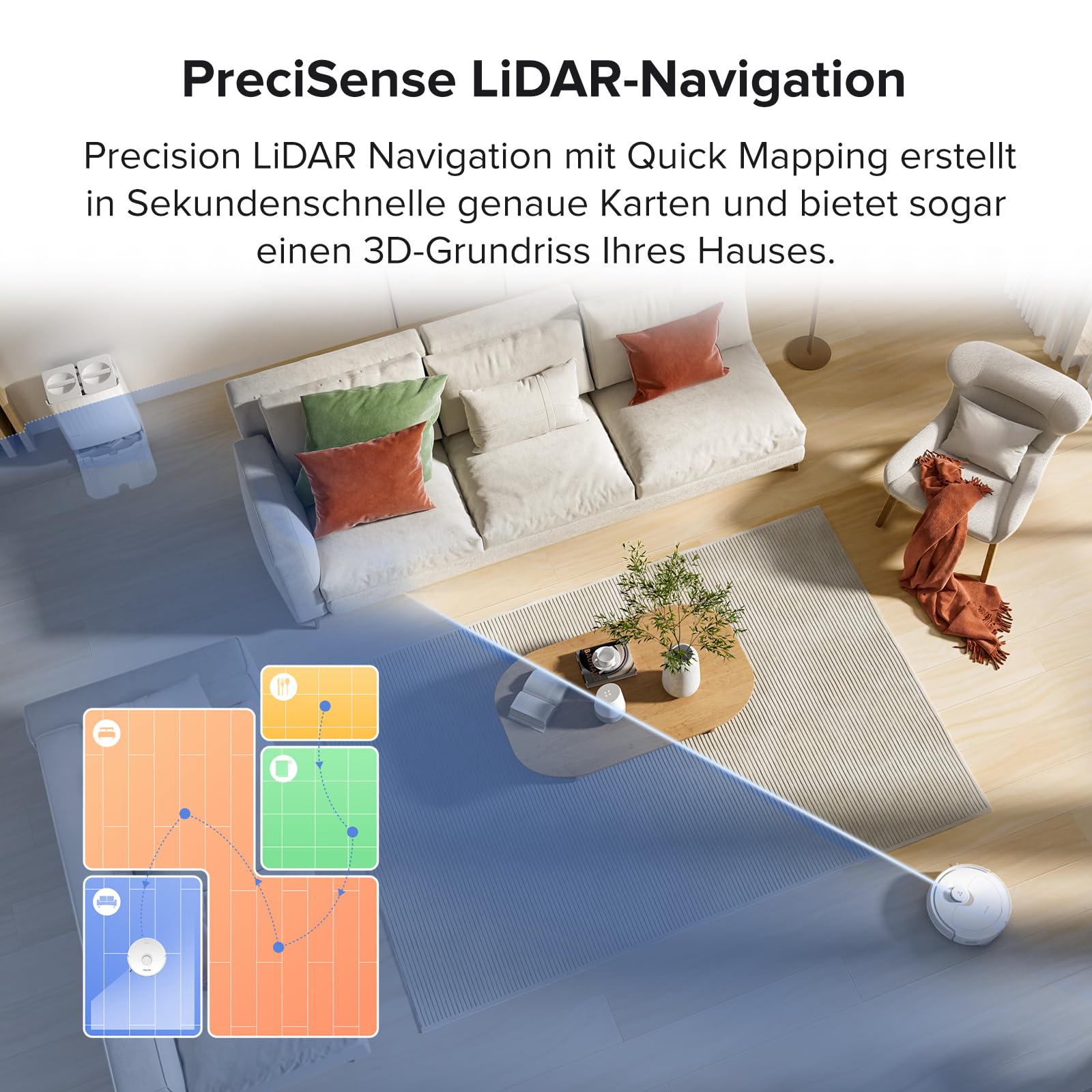 • Reactive 3D-Hindernisumgehung, PreciSense-LiDAR-Navigation. Dein Saugroboter mit Absaugstation kennt intelligent die Hindernisse und fährt potenzielle Gefahren um. Das strukturiertes 3D-Licht und die Infrarot-Bildtechnik macht es möglich, eine automatische und unterbrechungsfreie Reinigung im Hintergrund zu führen. roborock findet den schnellsten Weg zum Schmutz: Beim ersten Durchlauf erstellt er eine detaillierte Karte per LiDAR-Navigationssystem und aktualisiert sie jedes Mal.