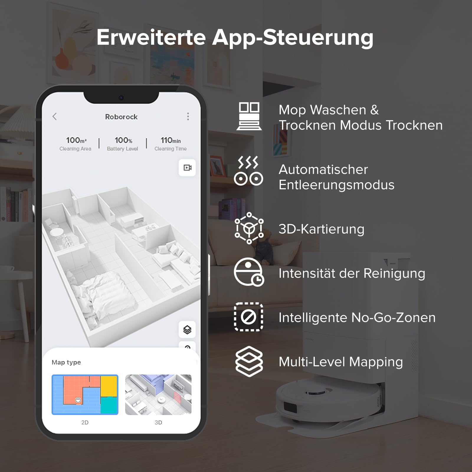 • Intelligentere App: Mit der 3D-Kartierung baust du dein Hause mit Details wie Möbeln nach, um eine präzise Karte für die bestmögliche Reinigung zu erhalten. Du kannst in der roborock-App auch unsichtbare Wände einzeichnen, um bestimmte Bereiche von der Reinigung auszuschließen. Erkennt automatisch unerschiedliche Etagen deines Zuhauses. Setze den Saugroboter einfach auf dem Boden ab. Es werden bis zu vier Stockwerke unterstützt.