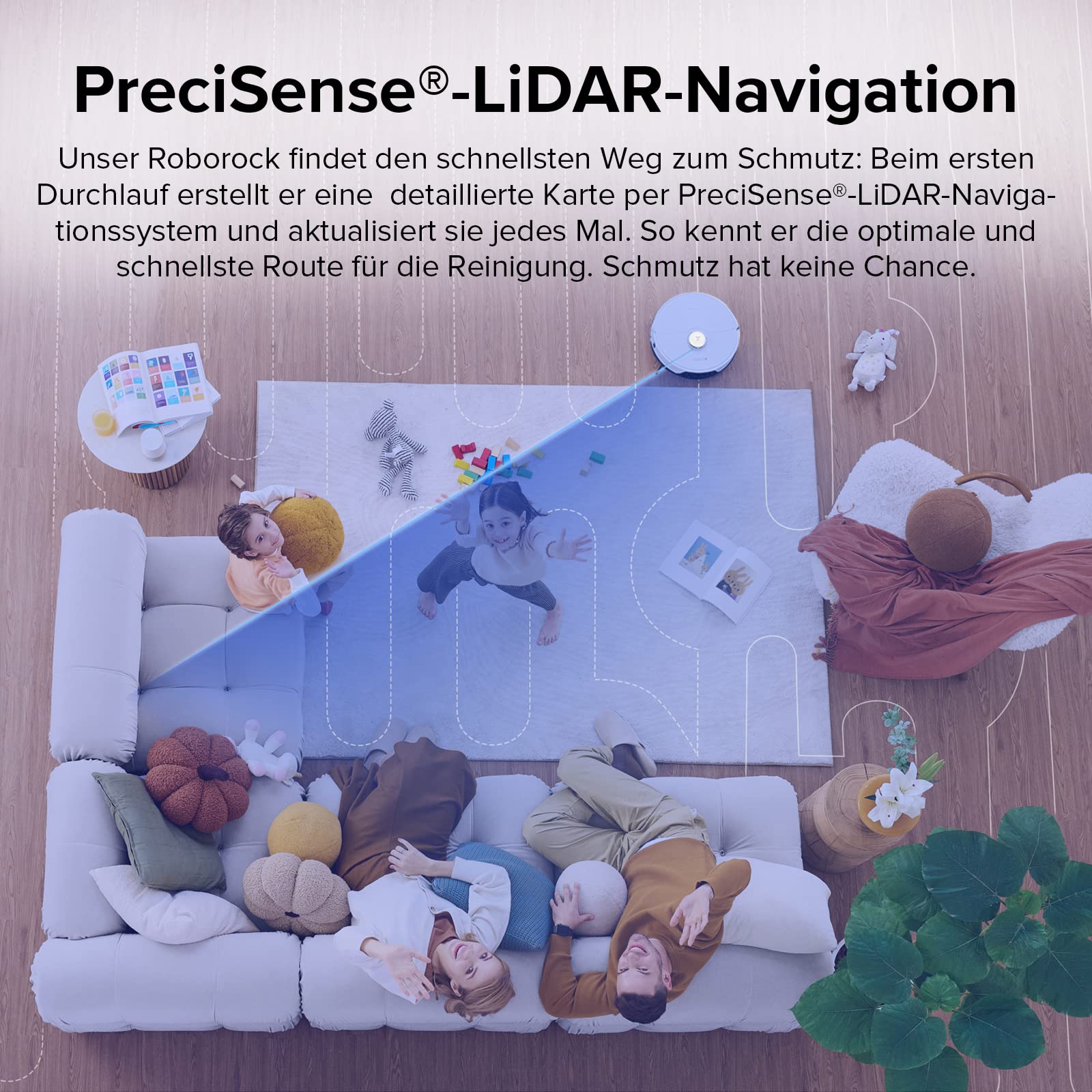 • 【Präzisionsnavigationssystem】 Das Präzisionsnavigationssystem erstellt detaillierte Karten, um eine optimale Route für eine schnellere Reinigung zu finden. Der S8 roboter staubsauger kann leicht feststeckende Stellen automatisch erkennen und unsichtbare Wände in der Roborock-App zeichnen, um No-Go-Zonen einzurichten.