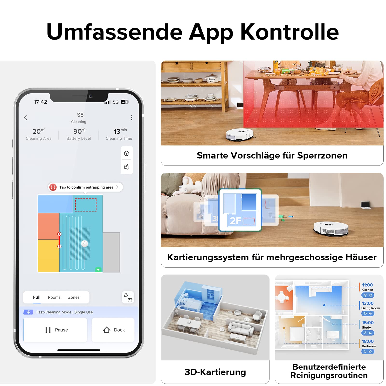 • 【Benutzerdefinierte Routinen】 Benutzerdefinierte Reinigungsroutinen ermöglichen es dem saugwischer roboter, regelmäßige oder bei Bedarf Reinigungsroutinen für bestimmte Bereiche im Haus einzustellen. Wenn die Reinigung abgeschlossen oder der Akku schwach ist, kehrt er automatisch zur Ladestation zurück.