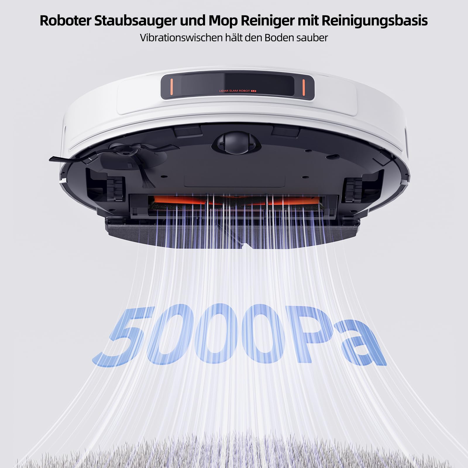 - 【5000 Pa Starke Saugkraft】Mit einer überragenden Saugkraft von 5000 Pa, drei Saugstufen und einem extra starken automatischen Teppich-Modus nimmt der Roboter mühelos Schmutz, Tierhaare und sogar nicht wahrnehmbaren Staub auf, der sich tief in Teppichen versteckt. So sorgt er für ein sauberes und ordentliches Zuhause.