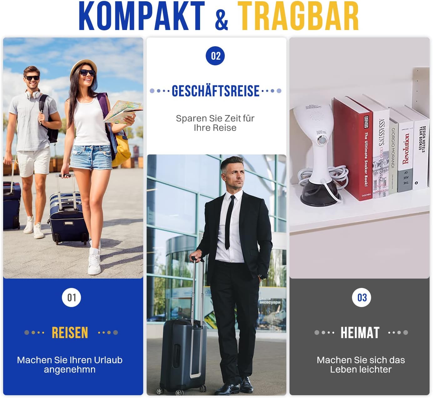 - 【Leichte und tragbare Größe】Die leichte und tragbare Größe und das ergonomische Design in der Hand sorgen für eine komfortable Steuerung. Dieser Steamer ist einfach zu bedienen, aufzubewahren und perfekt für zu Hause, im Büro und auf Reisen.Sie müssen an Ihren Reisezielen nicht mehr nach rostigen und ineffizienten, sperrigen Bügeleisen suchen. Holen Sie sich diesen clothes steamer, um das Leben und die Arbeit zu erleichtern.