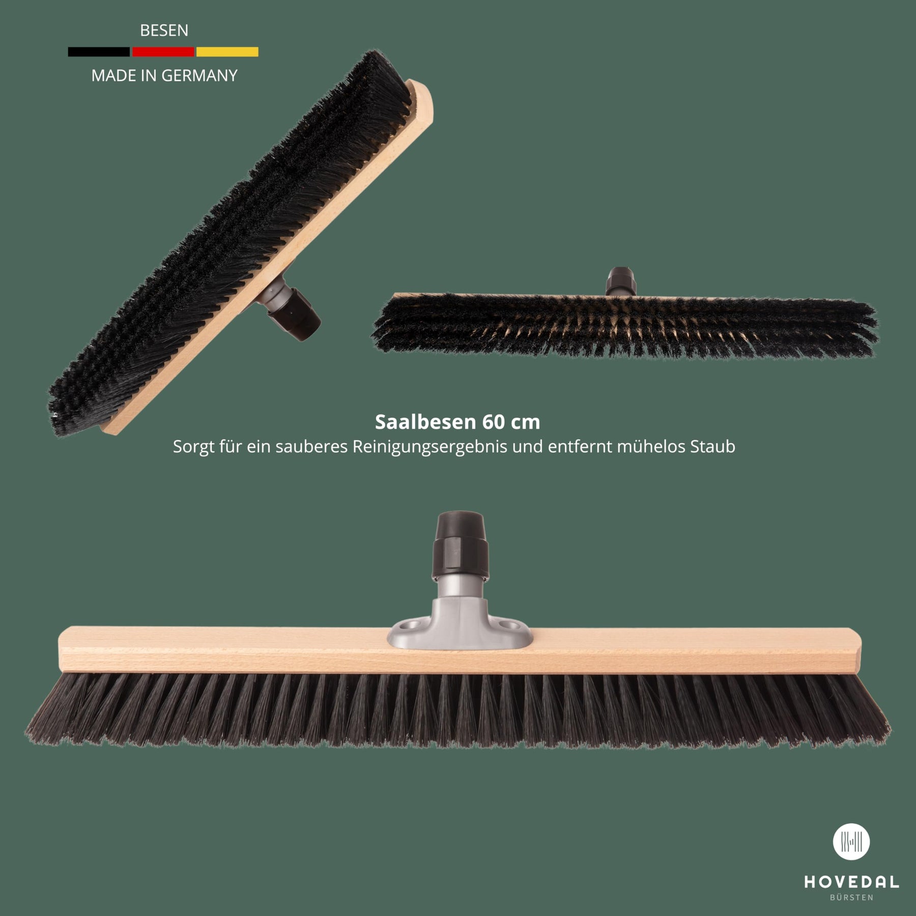Einzelheiten: Handliches und praktisches Set bestehend aus 1x Saalbesen und 1x Teleskopstiel - Für die saubere und gründliche Reinigung von glatten Böden, Fliesen, Stein, Hartboden, Holzboden, Parkett / Parkettboden, Laminat, für Werkstatt als Werkstattbesen, Grossraumbesen, für Innen, Innenbereich, Drinnen, Wohnung, Haus. Der Kehrbesen im Detail: Besenkopf aus Holz ist Qualität hergestellt in Deutschland. Feine und weiche Borsten sind robust und besonders gut geeignet zum Entfernen von Staub und Schmutz auf glatten Böden. Die seitlichen Borsten des Holzbesens sind schräg angeordnet und stehen über den Holzkörper heraus – Durch die schräge Anordnung der Besenhaare entsteht der ideale Reinigungswinkel für die gründliche Reinigung bis in die Ecken. Die abgerundeten Besenkanten schonen zusätzlich Wände, falls der Besen beim Fegen anstößt. Handlicher Besen mit Arbeitsbreite von ca. 60 cm – Ermöglicht leichtes, wendiges und müheloses arbeiten. Schönes und elegantes Design – Der Besen besteht aus rohem Holz und feinen Borsten – Durch das schöne und elegante Design passt der Besen sehr gut in eine moderne Umgebung. Stabiler Besen / Haarbesen mit Gewinde für Besenstiele. Länge/Arbeitsbreite ca. 60 cm, Breite ca. 8 cm, Höhe ca. 7,5 cm. Der Teleskopstiel im Detail: Langer und stabiler Teleskopstiel mit Gewinde ist Made in Italy - Besenstiel gewährleistet hohe Stabilität beim Reinigen - Stufenlos verstellbarer von ca. 80 cm bis ca. 140 cm – Für die optimale Arbeitshöhe und platzsparende Aufbewahrung nach dem Gebrauch. Einfache Handhabung und sofort einsatzbereit ohne kompliziertes Zusammenbauen oder Montage - Stiel wird in den Besen geschraubt und ist sofort arbeitsbereit. Tipp: Lagern Sie den Besen immer hängend, damit sich die Haare nach dem Kehren entfalten können und die Borstenstruktur nicht zerdrückt / beschädigt wird.