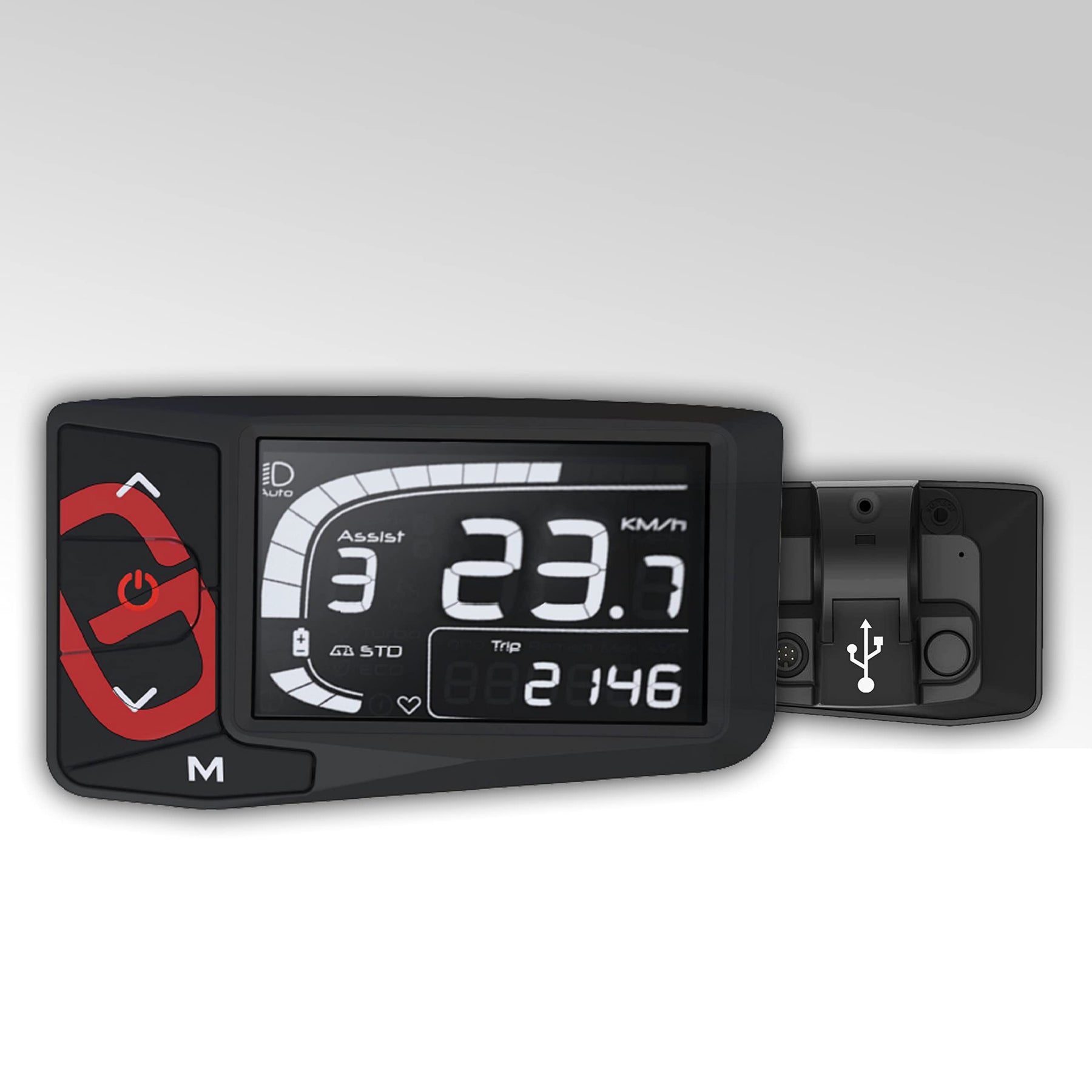 • das LCD-Display mit USB-Lademöglichkeit zeigt von der Geschwindigkeit bis zum Batteriestand zahlreiche Informationen