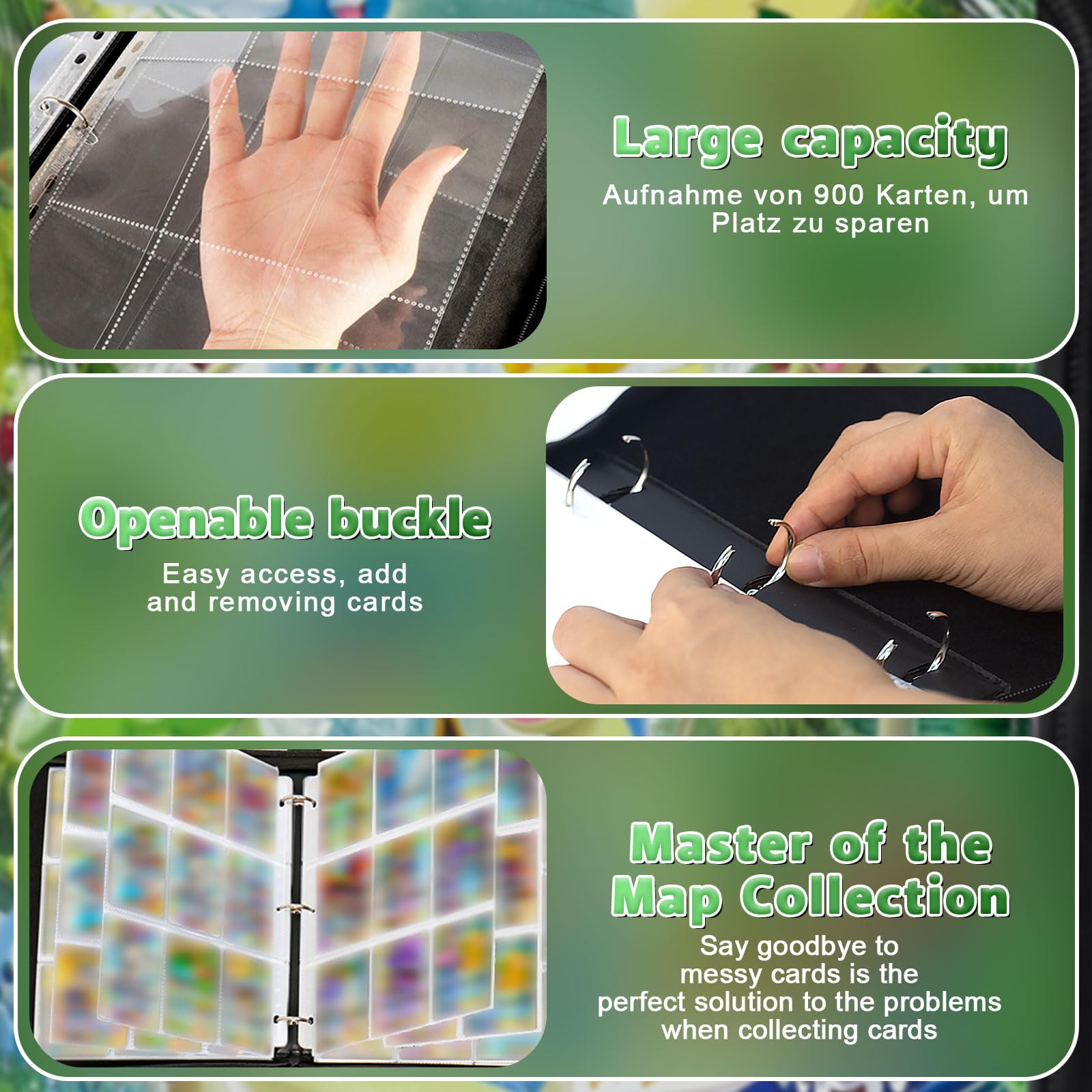 - 【Kapazität】Das Sammelkarten Album hat 9 Kartenfächer pro Seite, doppelseitiges Design, 50 herausnehmbare Seiten, und kann bis zu 900 Karten halten. Transparente Kartentaschen machen es einfach, Karten realistisch anzuzeigen, ohne sie zu entfernen. Perfekt zum Sammeln und Aufbewahren von Sammelkarten.