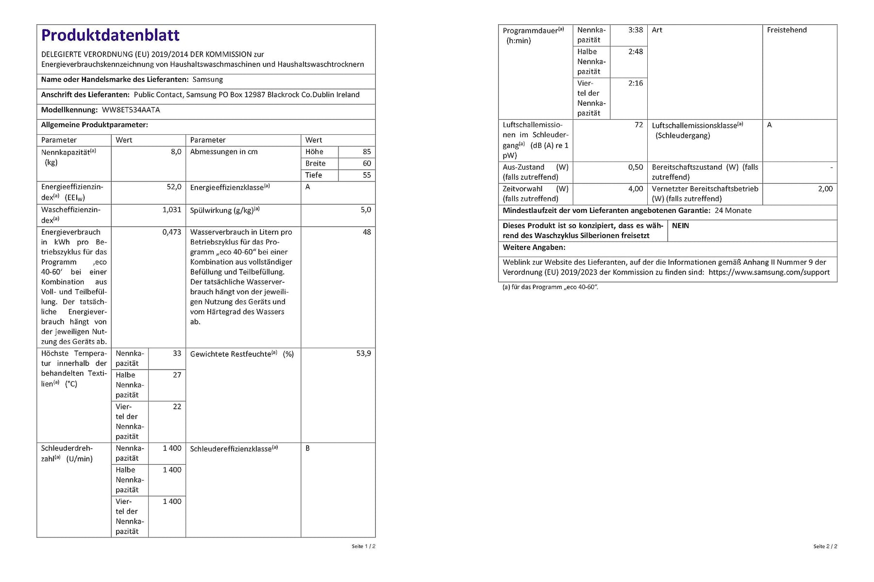 - Lieferumfang: 1 x Samsung WW8ET534AATAS2 Waschmaschine, 8 kg, 1400 U/min, Maße: 60 x 85 x 55 cm, Farbe: Weiß/Schwarz
