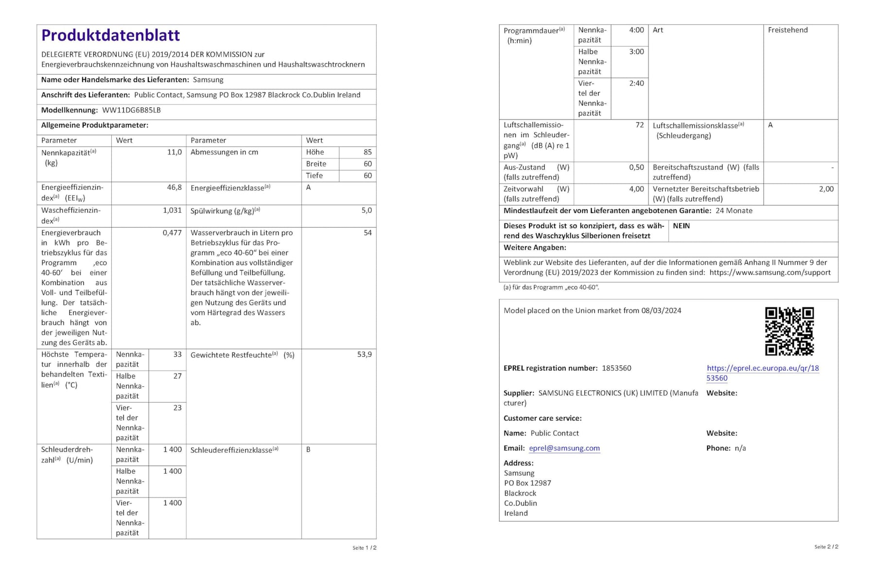 - Lieferumfang: 1 x Samsung WW11DG6B85LBU2 Waschmaschine, 11 kg, 1.400 U/min, EEK: A (-10 %), Maße (BxHxT): 60 x 85 x 60 cm, Farbe: Schwarz