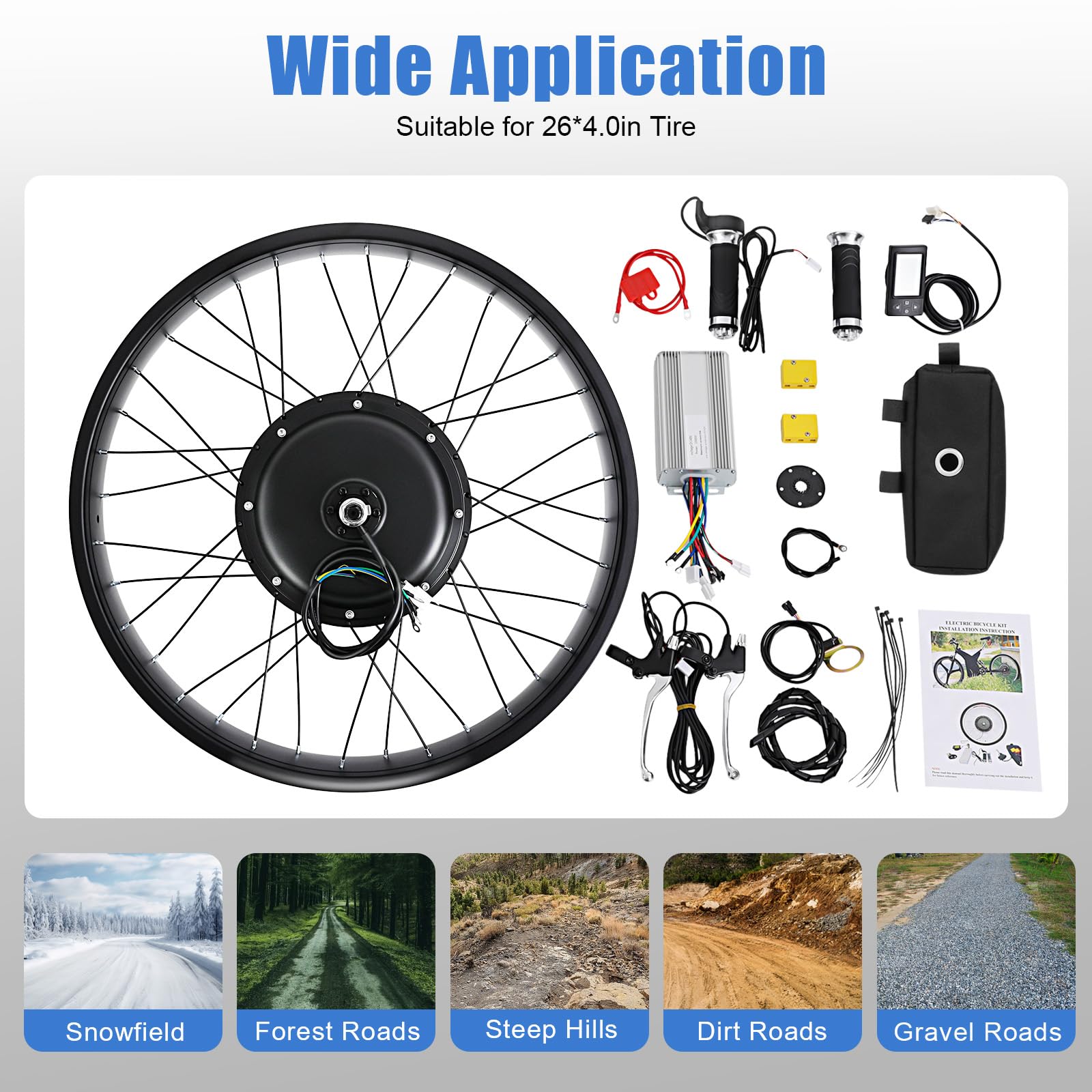 3.Anwendung: Der Fahrradumbaukit ist für den Fahrradumbau geeignet. Der Raddurchmesser ist 26 Zoll, die für die 26x4 Zoll Reifen geeignet sein kann.