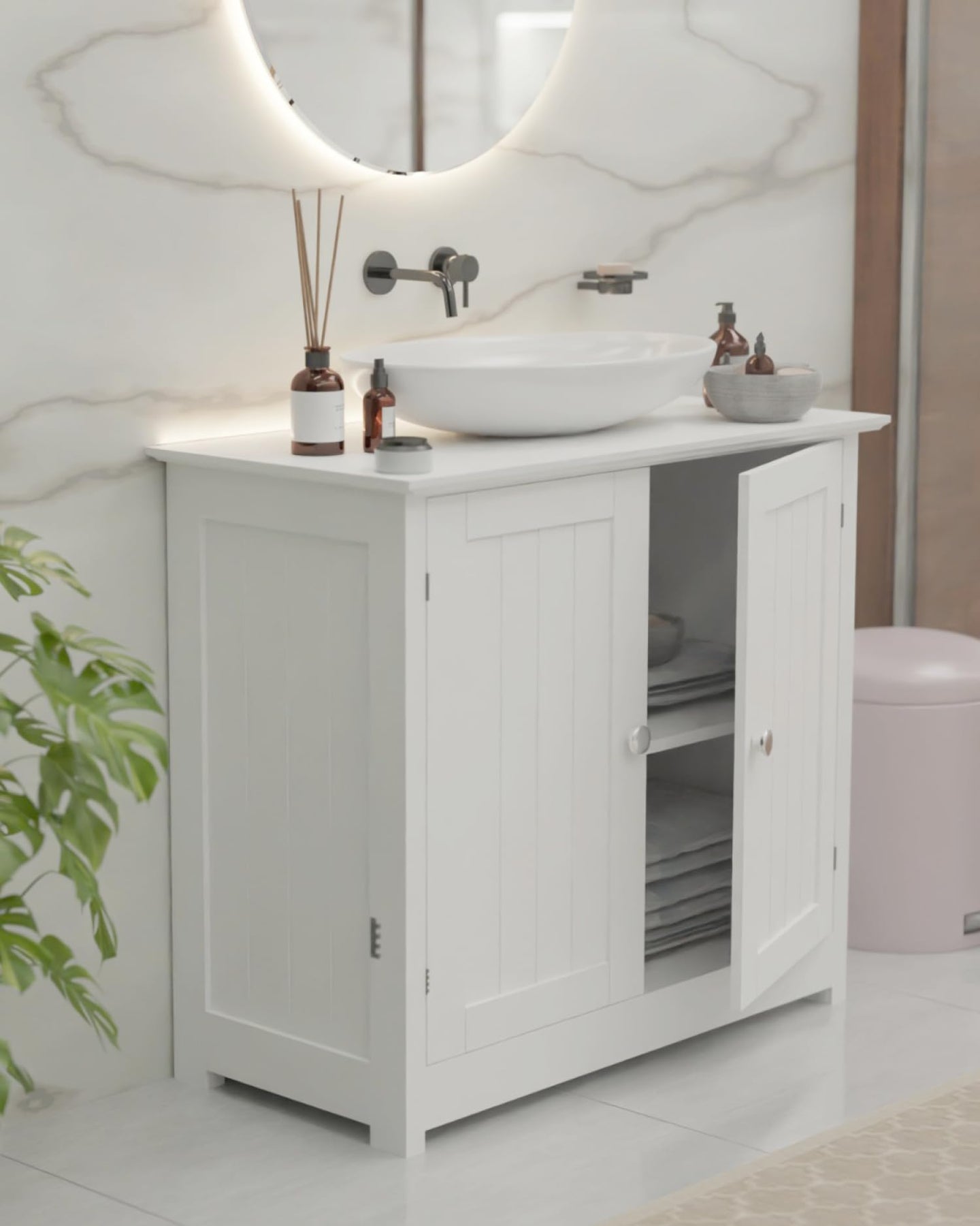 - MONTAGE BADUNTERSCHRANK WASCHBECKEN: Die Montage vom Waschunterschrank ist dank der verständlichen und einfachen Montageanleitung schnell erledigt. Der Siphonausschnitt hat die optimale Größe für das Abflussrohr unter dem Waschbecken.