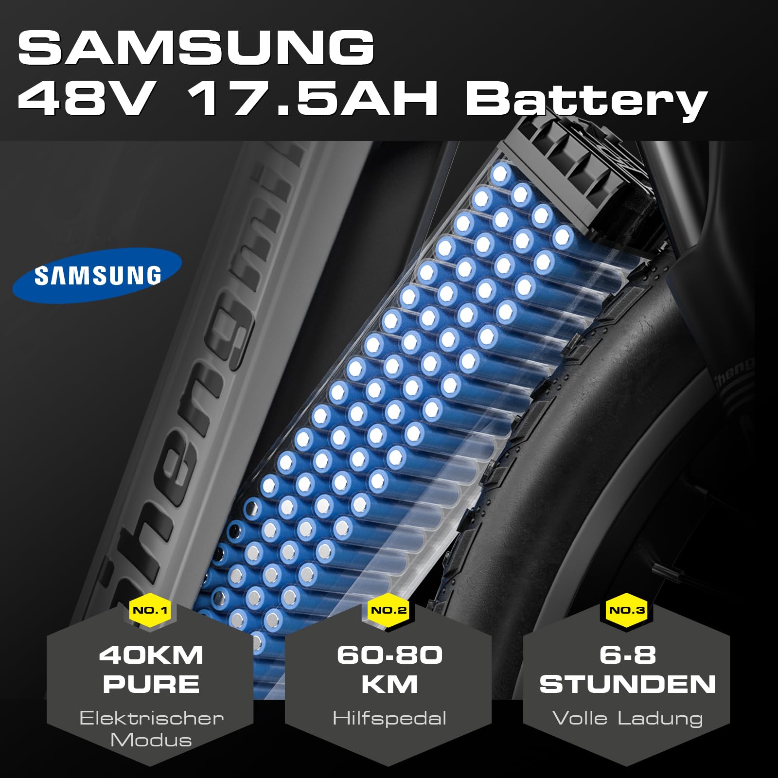Dieses Elektrofahrrad ist mit 26 Zoll 3,0 breiten Reifen und einem Rahmen aus Aluminiumlegierung ausgestattet. Es ist aus hochwertiger Aluminiumlegierung, 7-Gang-Edelstahl-Shimano-Kette, leicht und langlebig. Die Vorderseite des E-Bikes ist mit LED-Scheinwerfern ausgestattet, um Sie nachts sichtbar und sicher zu halten.