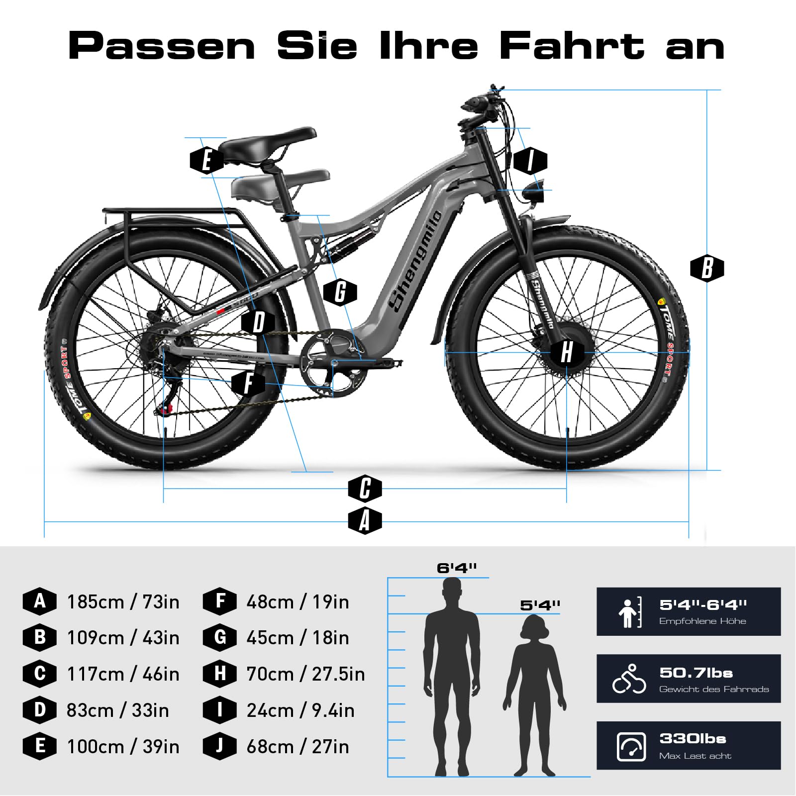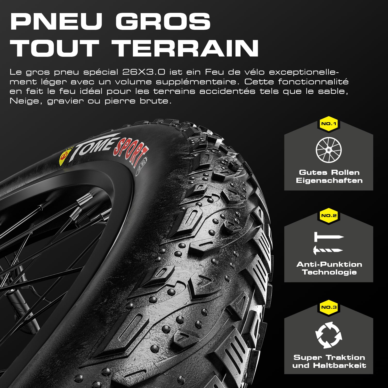 - 【𝟐𝟔-𝐙𝐨𝐥𝐥-𝐅𝐞𝐭𝐭-𝐑𝐞𝐢𝐟𝐞𝐧】 Das S600 ist mit 26-Zoll-Fett-Reifen ausgestattet, die 3,0 Zoll breit sind. Diese breiten Reifen bieten hervorragende Stabilität und Grip und sorgen für eine komfortable und sichere Fahrt, auch auf Schnee, in den Bergen, in der Wüste und auf kurzen Strecken.