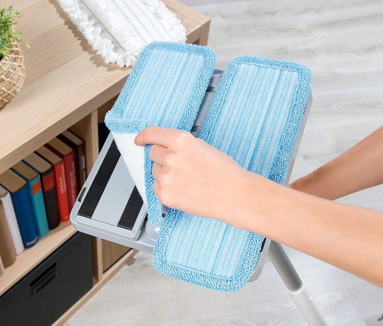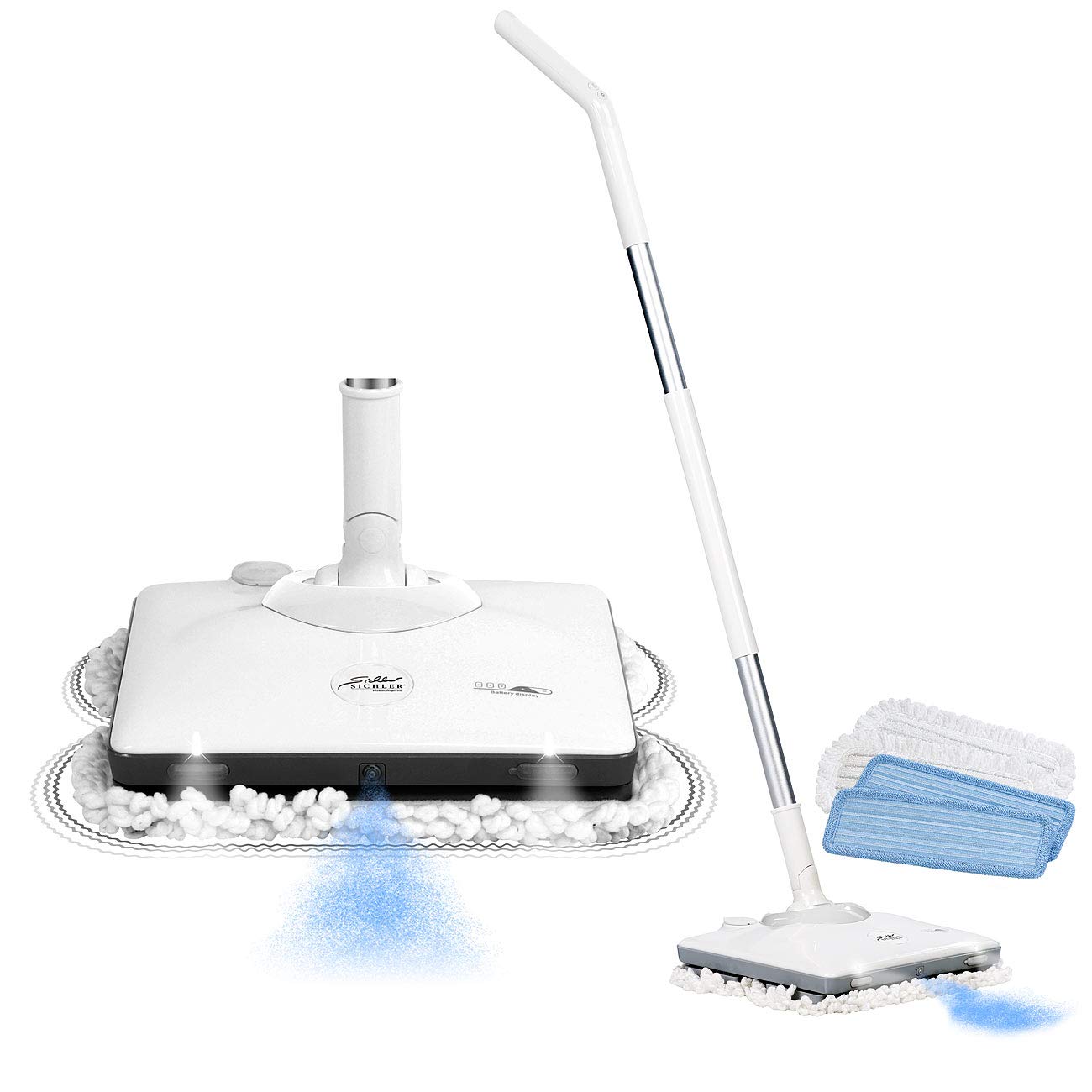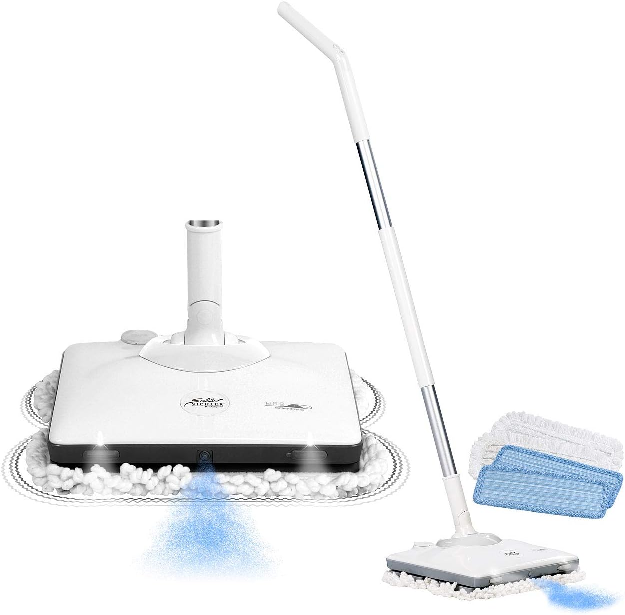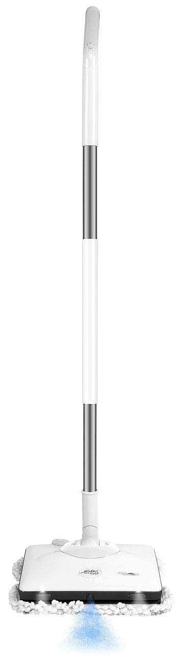 - Für alle glatten Böden wie Fliesen, Laminat, Parkett, Schiefer, Marmor, Holzböden u.v.m. • Sprüh-Funktion: Wischwasser-Tank mit 230 ml Volumen (nicht für Reinigungsmittel geeignet) • 2 weiße LEDs an der Vorderseite zur Boden-Beleuchtung • Stromversorgung Handgriff: 1 Batterie Typ 23A (12 Volt, enthalten)