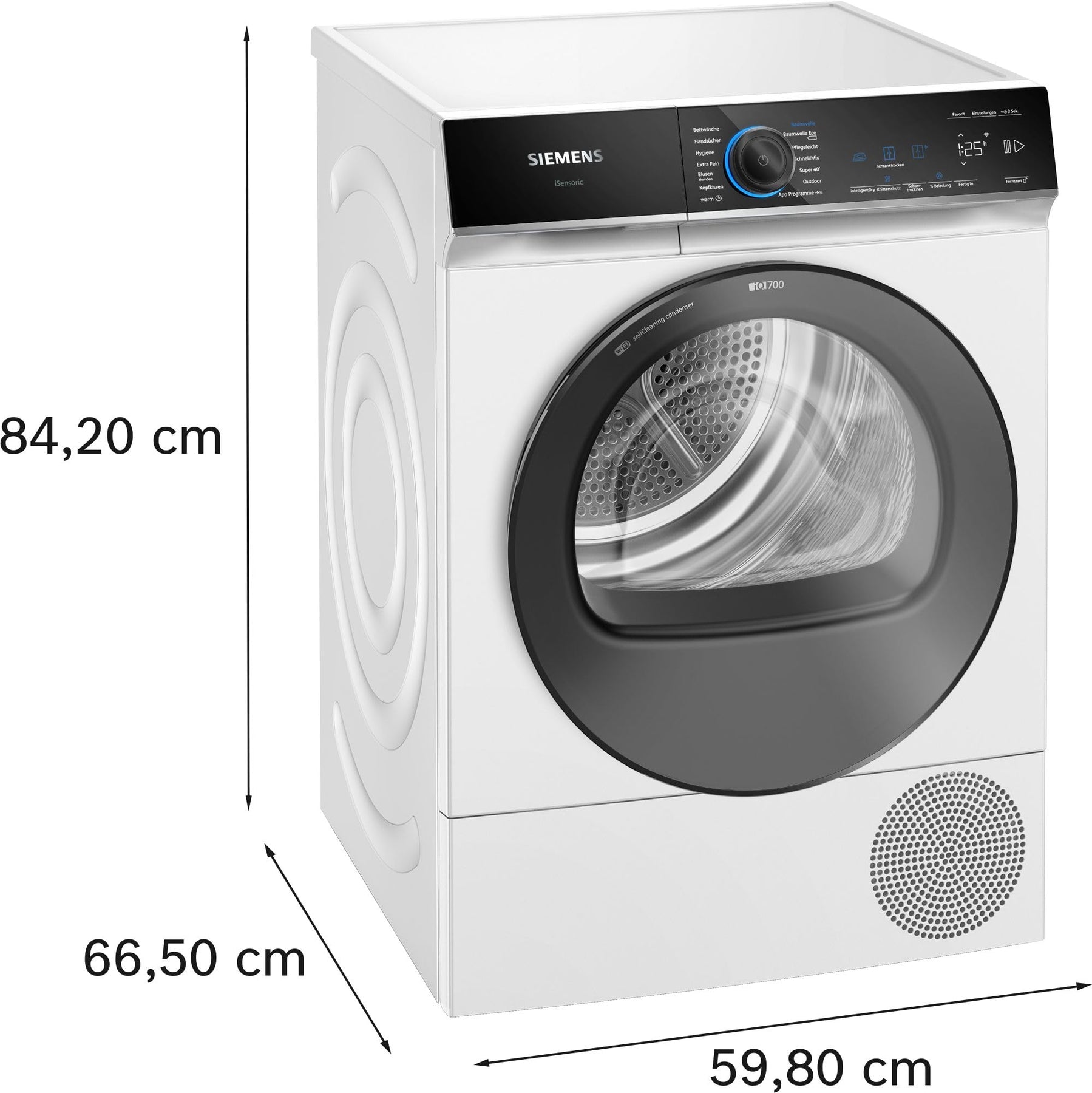 Die Maße des Siemens WQ35B2B30 betragen 84.2 cm in der Höhe und 59.8 cm in der Breite, mit einer Tiefe von 61.3 cm. Die Gerätetiefe inklusive Tür beträgt 66.5 cm und mit geöffneter Tür 110.5 cm. Diese kompakten Maße ermöglichen eine flexible Platzierung in deiner Wohnung, auch unterbaufähig ab einer Nischenhöhe von 85 cm.