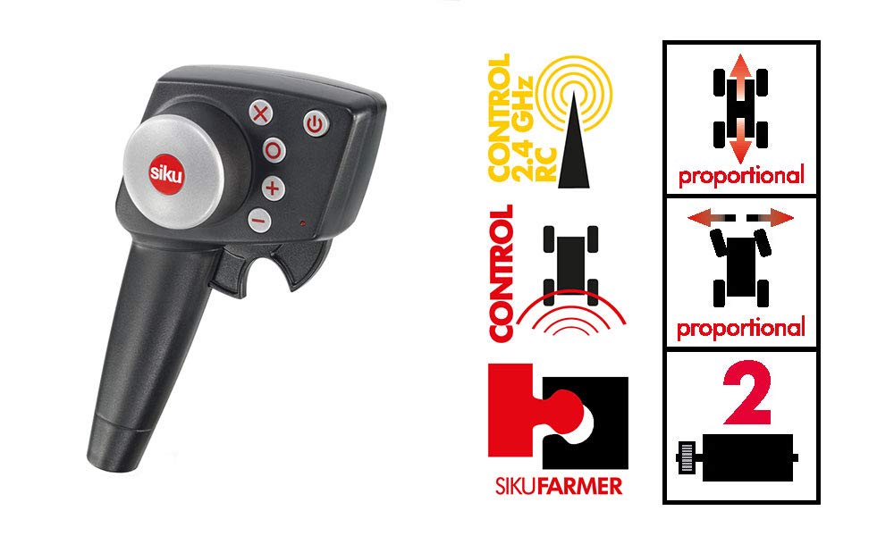 Drei neue Traktorenmodelle ergänzen die SIKUControl32-Serie im unteren Preissegment. Durch Nutzung vorhandener Funk-Komponenten auf Basis des 2,4 GHz-Bandes und einer einfacheren Produktausführung ist es gelungen, die hochkomplexe SIKUControl32-Technik in ein günstigeres Fahrwasser zu leiten. Die aus Metall und Kunststoff gefertigten stabilen und hochwertigen Traktoren werden mit einem neuentwickelten Fernsteuermodul kinderleicht zu steuern sein. Fahr- und Lenkfunktionen sind proportional ausgeführt und ermöglichen präzises Fahren und Rangieren. Die Lichtfunktion an Front- und Heck ist während des Betriebs dauerhaft eingeschaltet. Im Stand-By-Betrieb, d.h. nach dem Anschalten des Modells und vor dem Verbinden mit dem Fernsteuermodul zeigt das Modell durch Blinken Betriebsbereitschaft an. Als Energieversorgung dienen drei handelsübliche Batterien des Typs „AAA“. Alternativ dazu können auch entsprechende wiederaufladbare Batterieakkus gleichen Typs verwendet werden. Sinkt die Batteriespannung während des Betriebs unter einen bestimmten Wert, zeigt das Modell durch schnelles Blinken an, dass die Batterien in Kürze leer sein werden. Das Fernsteuermodul wird ebenfalls mit zwei Batterien dieses Typs betrieben. Die Traktorenmodelle sind an Front und Heck mit Standard-SIKU-Kupplungen ausgerüstet, die manuell bedient werden. Somit können alle SIKUFarmer32 Anhänger und Anhängeräte für Front und Heck mit diesen Modellen genutzt werden. Das integrative Spielsystem wird auch mit den neuen Modellen fortgesetzt. Durch die im Heckbereich der Traktoren eingebaute Datenbuchse ist die Verwendung der Control-Zubehörmodelle wie Anhänger, Schwader und Pflug möglich. Bitte beachten Sie: die Lenkung muss bei diesem Modell erst justiert werden.