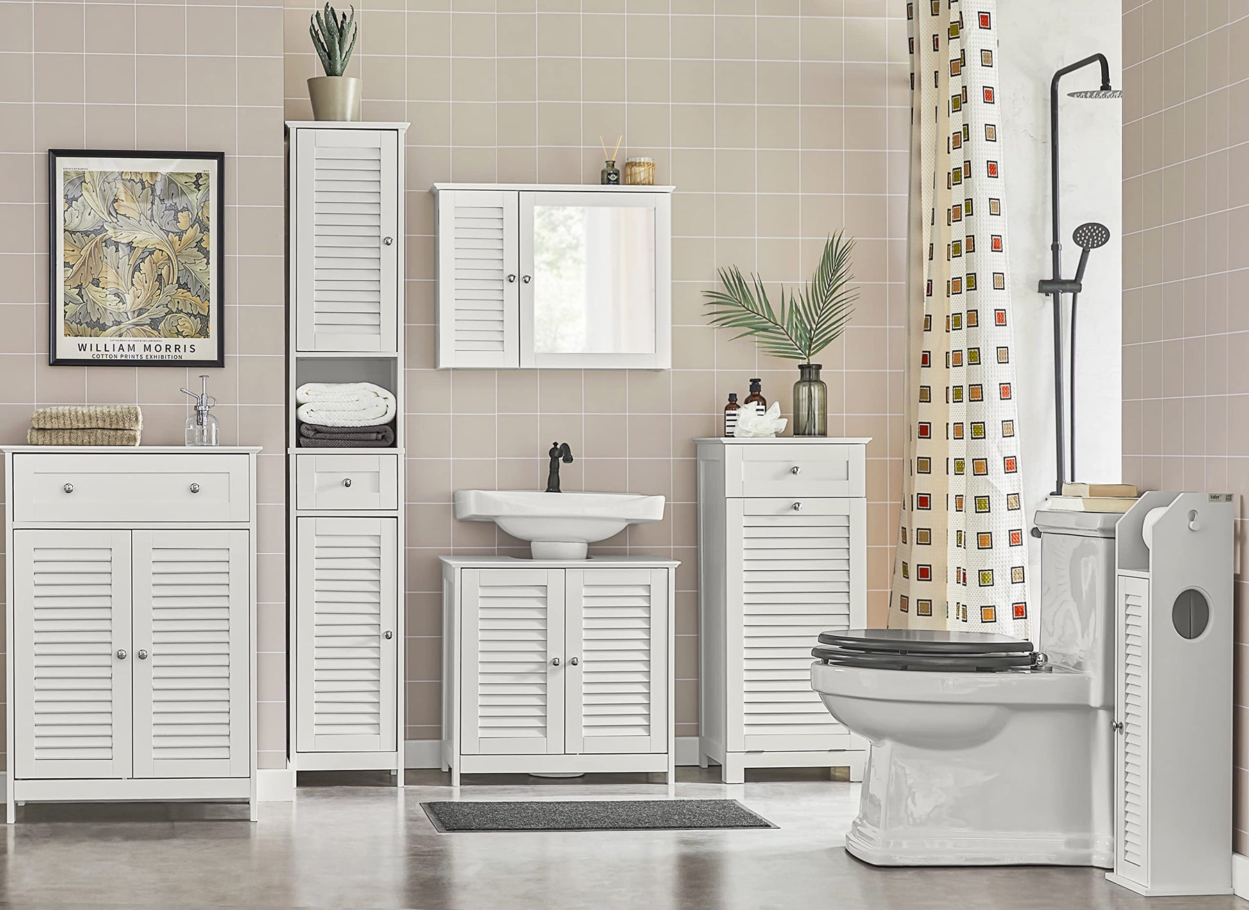 • Kann auch als 8-teiliges Set erworben werden: Waschbeckenunterschrank (FRG237-W), Spiegel (BZR55-W), Wäschetruhe (BZR73-W & BZR124-W), Toilettenrollenhalter (BZR49-W), Badkommode (FRG238-W und BZR39-W) und Hochschrank (FRG236-W)