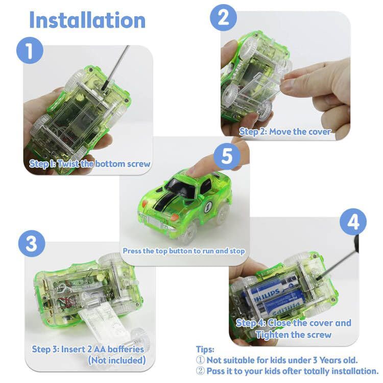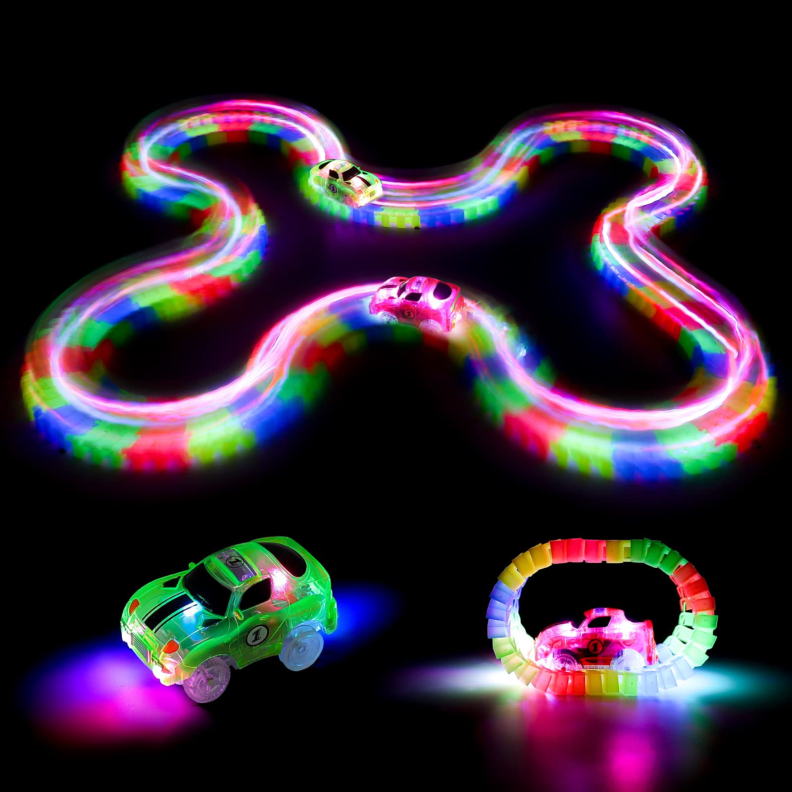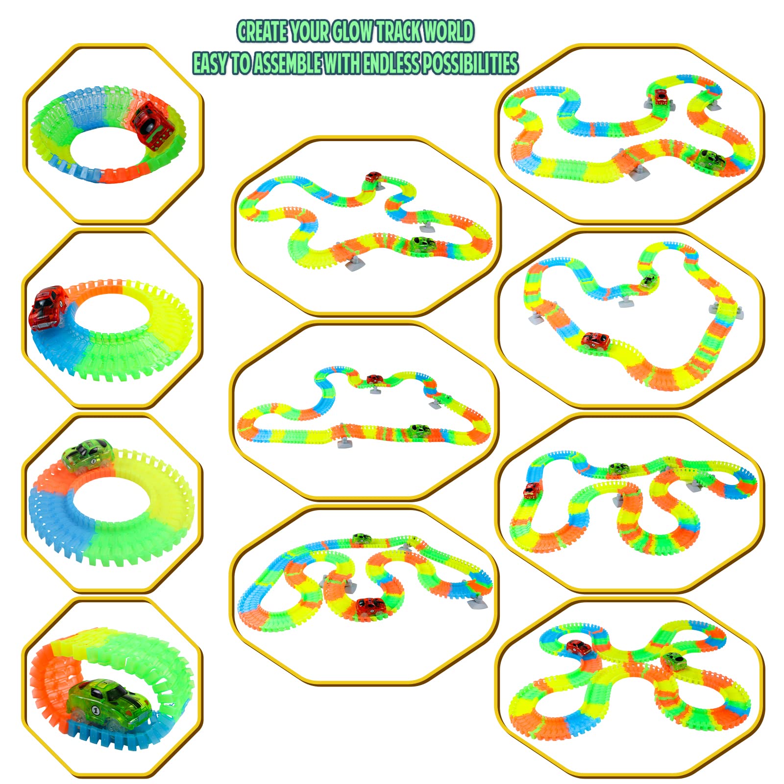 - 【Glow Tracks Auto Spielzeug ab 3 Jahre & Leucht Autorennbahn】In der dunklen Umgebung wird das glow cars spielzeug das auf den fantastischen leuchtend rennbahn fährt, das Kind sicherlich in Erstaunen versetzen. auch im Dunkeln, viadukte anbringen und mit den 2 mitgelieferten LED auto spielzeug Rennen fahren . 240 Stück rennbahn kinder 3 jahre set in mehrere Strecken unterteilt werden, mehrere Kinder können gemeinsam am Spiel teilnehmen. Spielzeugauto Größe: ca. 9 * 5 * 5,5 cm (benötigt 2AA, nicht enthalten)