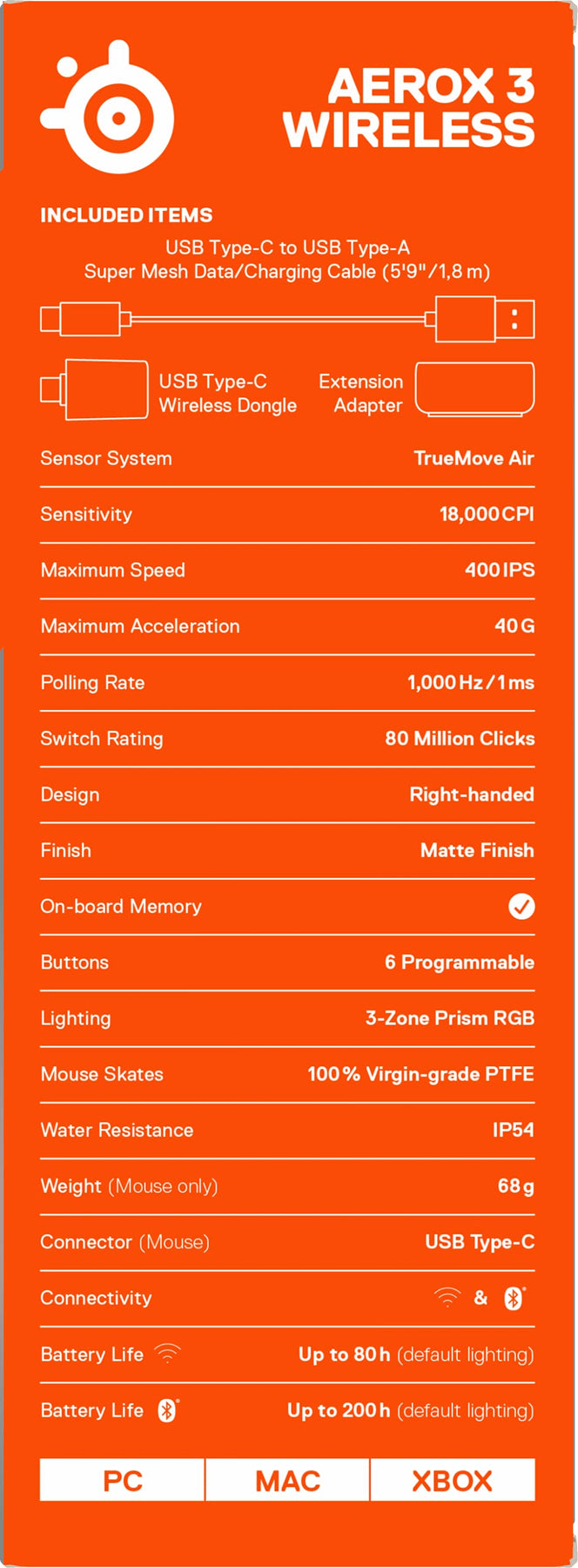 Die SteelSeries Aerox 3 Wireless Mouse 2022 hat ein ultraleichtes 68-g-Design, das perfekt für superleichte und schnelle Mausbewegungen optimiert ist. Ein leistungsorientierter optischer TrueMove Air-Sensor liefert pixelgenaues Tracking, mit Quantum 2.0 Dual Wireless für ein stabiles und zuverlässiges Signal. Der optimierte, schnell aufladbare Akku gewährleistet eine stressfreie kabellose Nutzung für 200 Stunden ununterbrochenes kabelloses Spielen im 2,4-GHz- oder Bluetooth-Modus, weiche Gleitpads aus 100 % reinem PTFE sorgen für verbesserte Kontrolle und Geschwindigkeit, die wasserfeste AquaBarrier™ bietet Sicherheit nach IP54 , und das USB-C-Kabel erleichtert die Konnektivität, das schnelle Aufladen und die Anpassung auf dem Aftermarket.