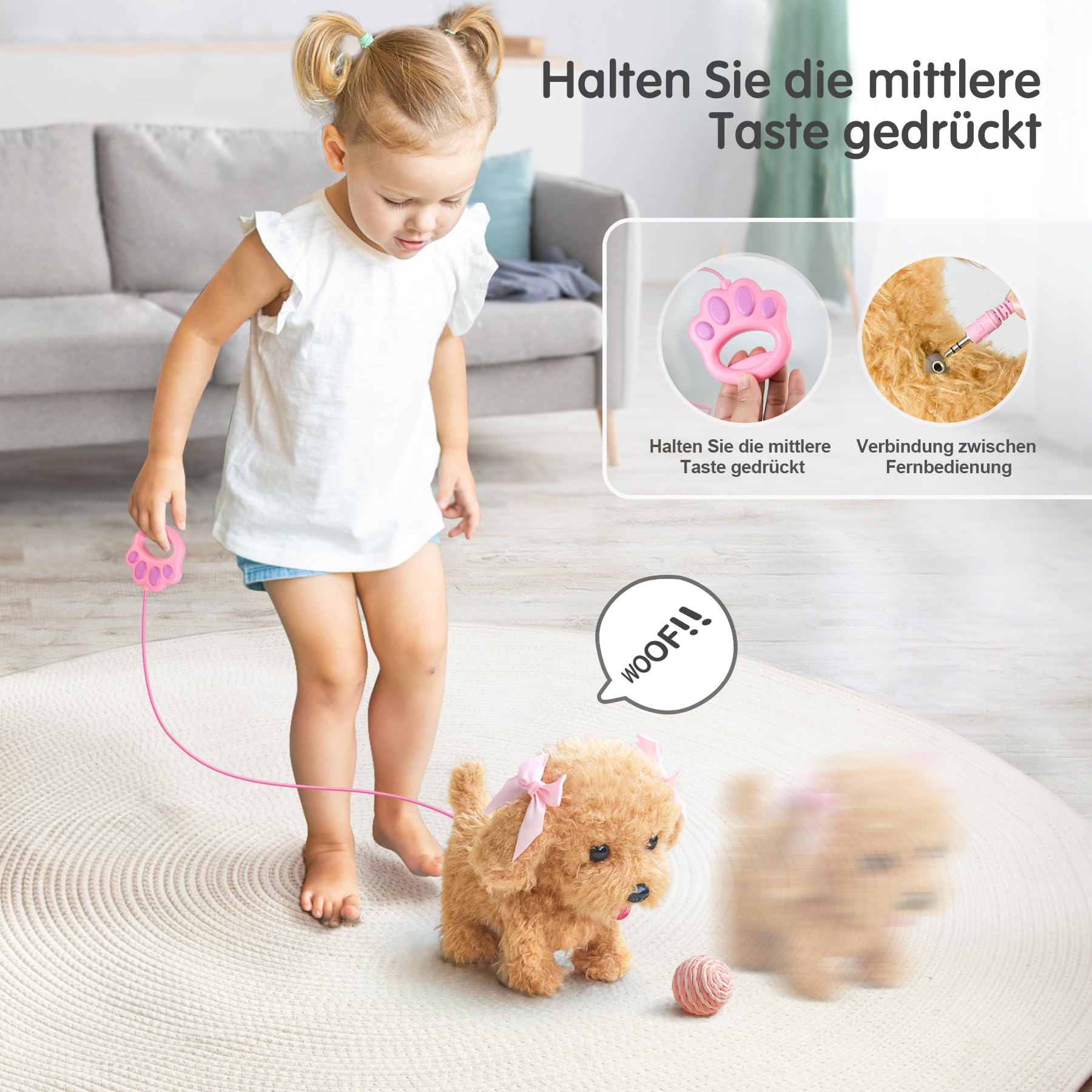 • FUNKTIONELLE LEINE FÜR SPIELZEUGHUND: Kind ist wirklich leicht zu manövrieren,im Nachen des Hundes ist ein 3,5mm Klinkenstecker um die Kabelfernbedienung anzuschließen und unten am Bauch liegt das Batteriefach für 3 AA-Batterien die nicht im Lieferumfang enthalten sind.Der Knopf an der Leine ist für Kinder einfach zu bedienen. Drücken Sie kurz den Griff am Zugdraht,der Hund kann bellen,mit dem Schwanz wedeln. Langes Drücken,der Hund bellt und rennt, wedelt mit dem Schwanz
