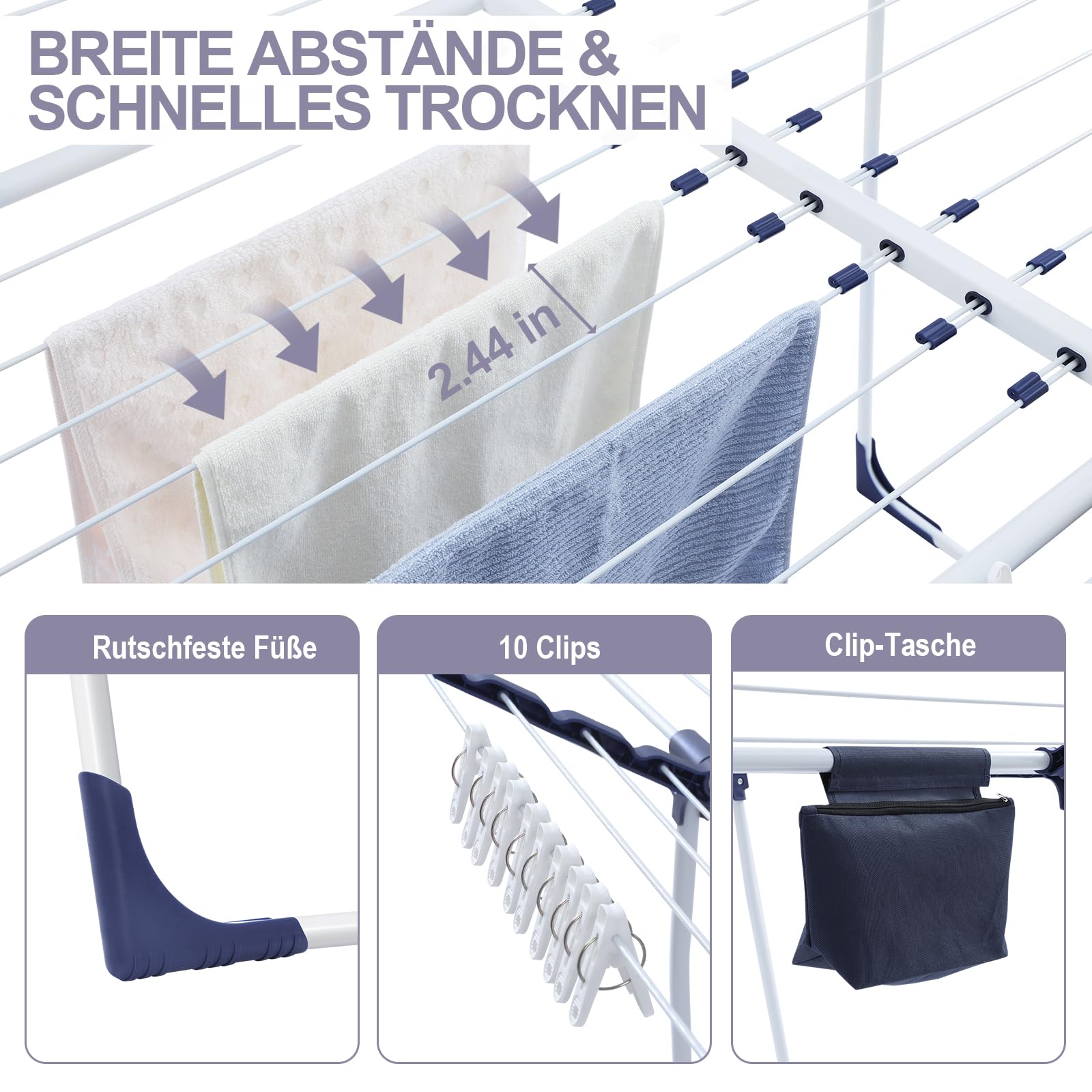- Maximierter Trocknungsraum: Unser wäscheständer misst 160,5 x 45 x 85,6 cm mit 24 aufhängestangen, 10 Clips und 1 Cliptasche. Effizientes Trocknen mit 6,2 cm Abstand, maximieren Sie Ihren Trockenraum, leicht unterzubringen für alle Arten von Kleidung